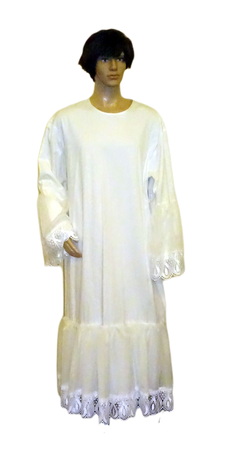 Albe, weiß, unten+ an den Ärmeln breite Spitze. Weitere gleiche Artikel U504-U506