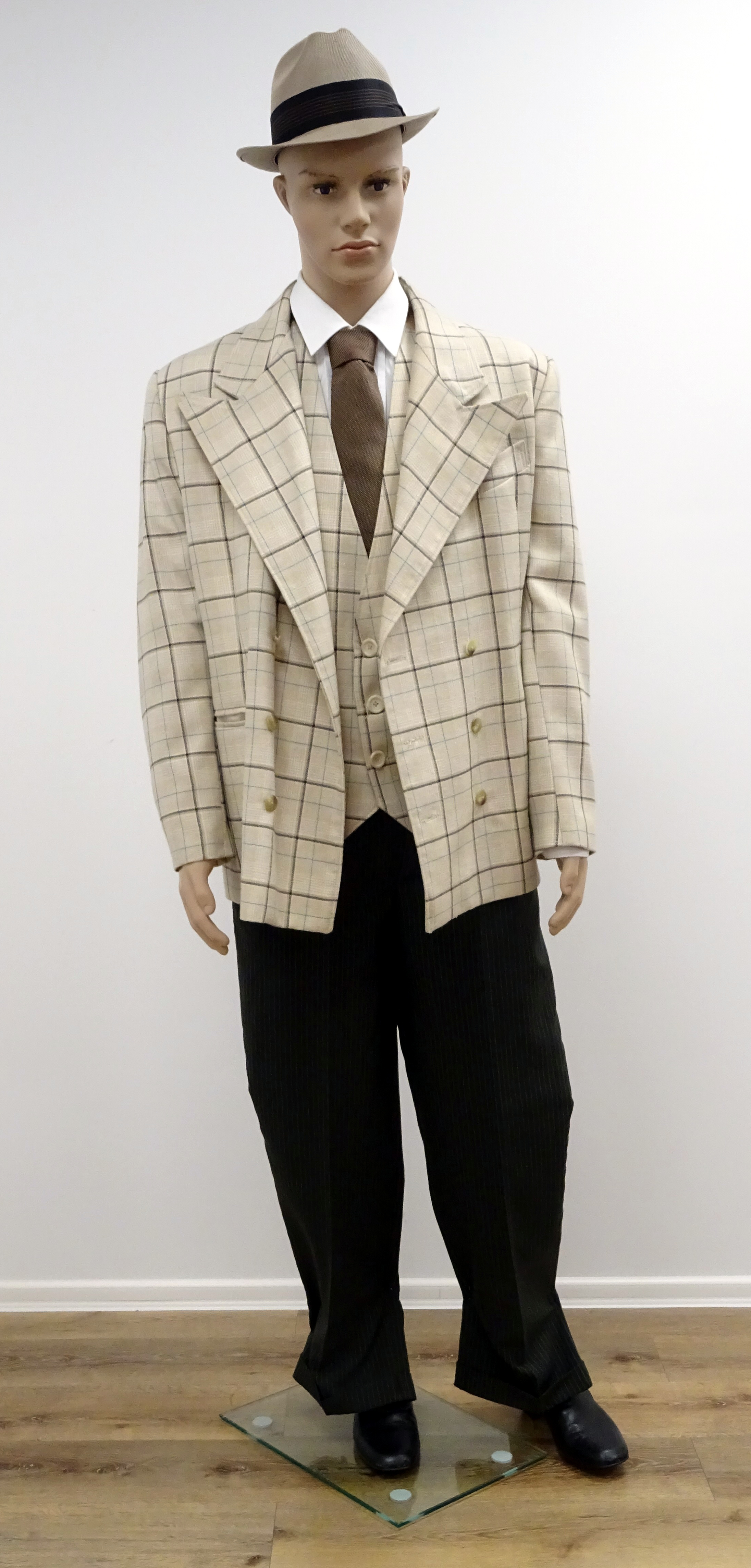 Anzug, 50er Jahre, 3 teilig mit gestreifter Hose + Weste + Jacket, beige großkariert, 2 reihig
