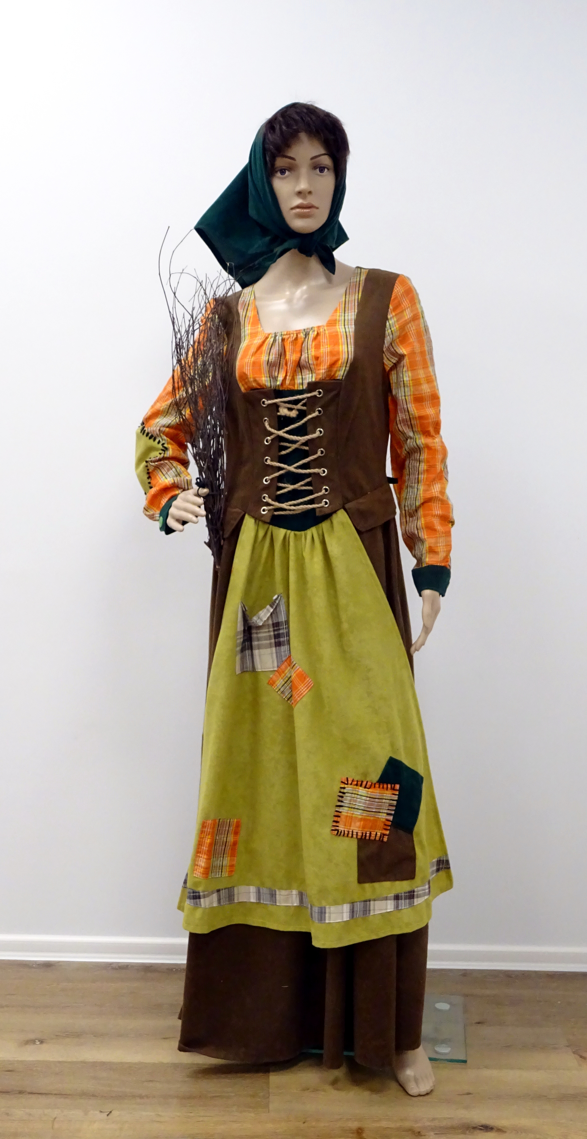 Bäuerin: Kleid- braun/orange, Ärmel und Einsatz am Ausschnitt kariert (orange), Schürze und Zierschnürung. Weitere gleiche Artikel B031, B033