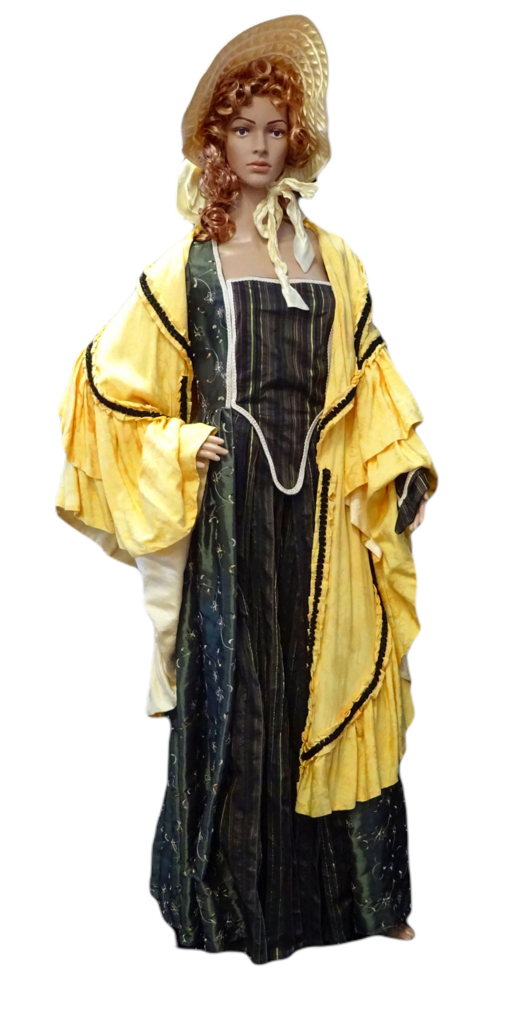 Biedermeier-Umhang: gelb mit schwarzer Zierpaspel mit Hut. Weitere gleiche Artikel U236 (blau/schwarz/grau) U237 (rot/weiß/schwarz)