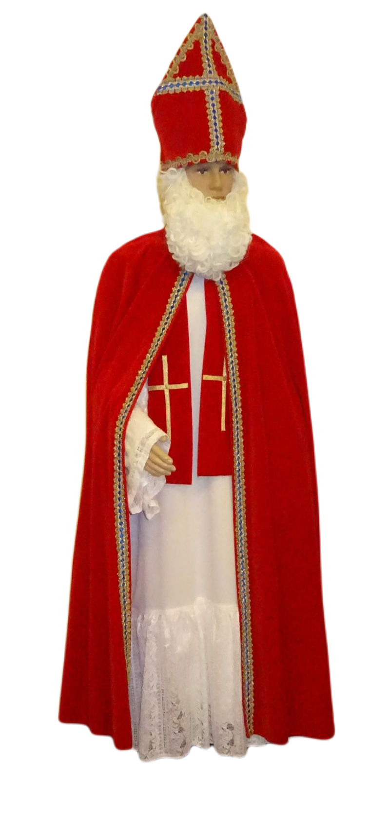 Bischof/ Nikolaus de luxe: Umhang, Mitra und Stola - roter Samt mit gold-blauer Borte
