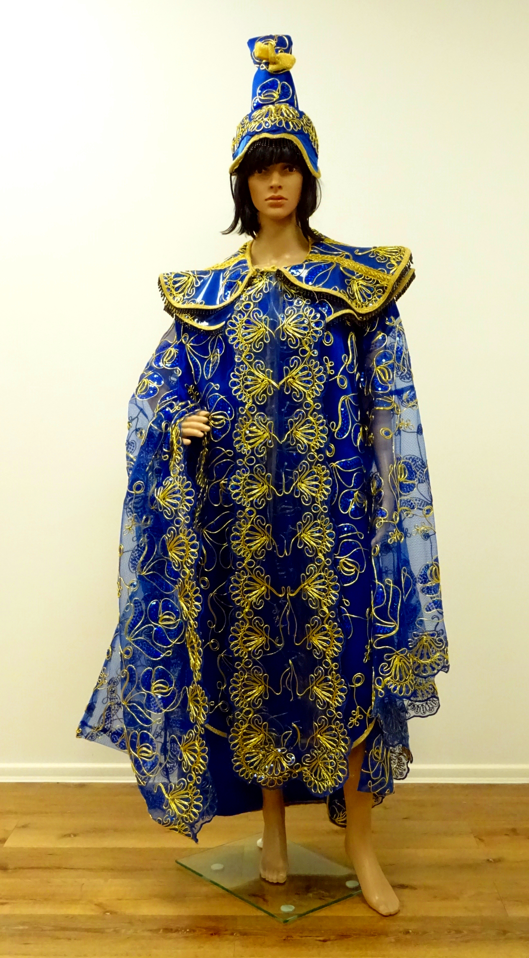 Chinesin: Umhang mit Ärmeln, Kopfbedeckung + Kragen mit Stola, blauer Tüll mit goldenen Pailettenstickerei