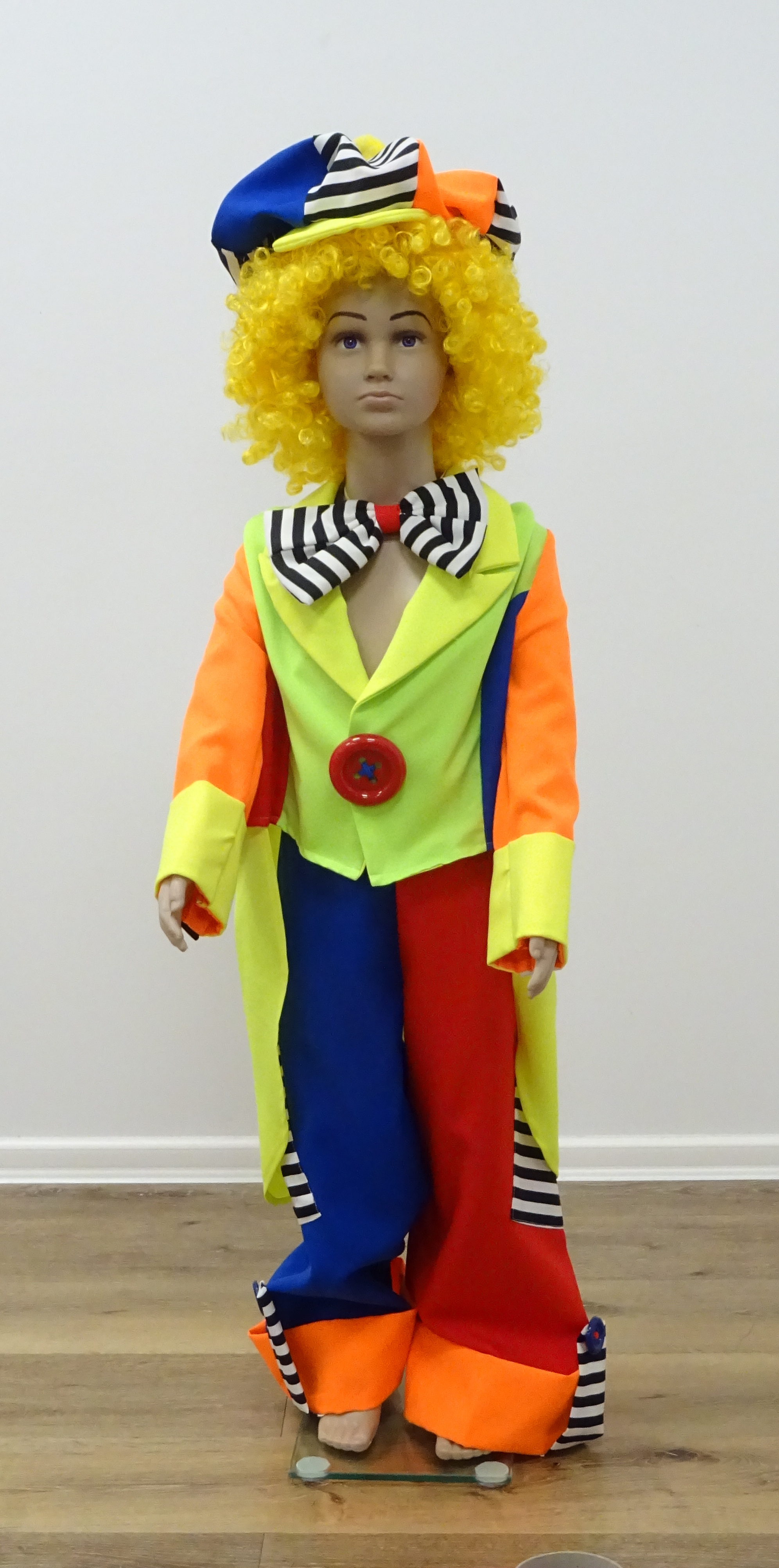 Clown: Hose + Frack, bunt, gestreifte Fliege, bunte Mütze