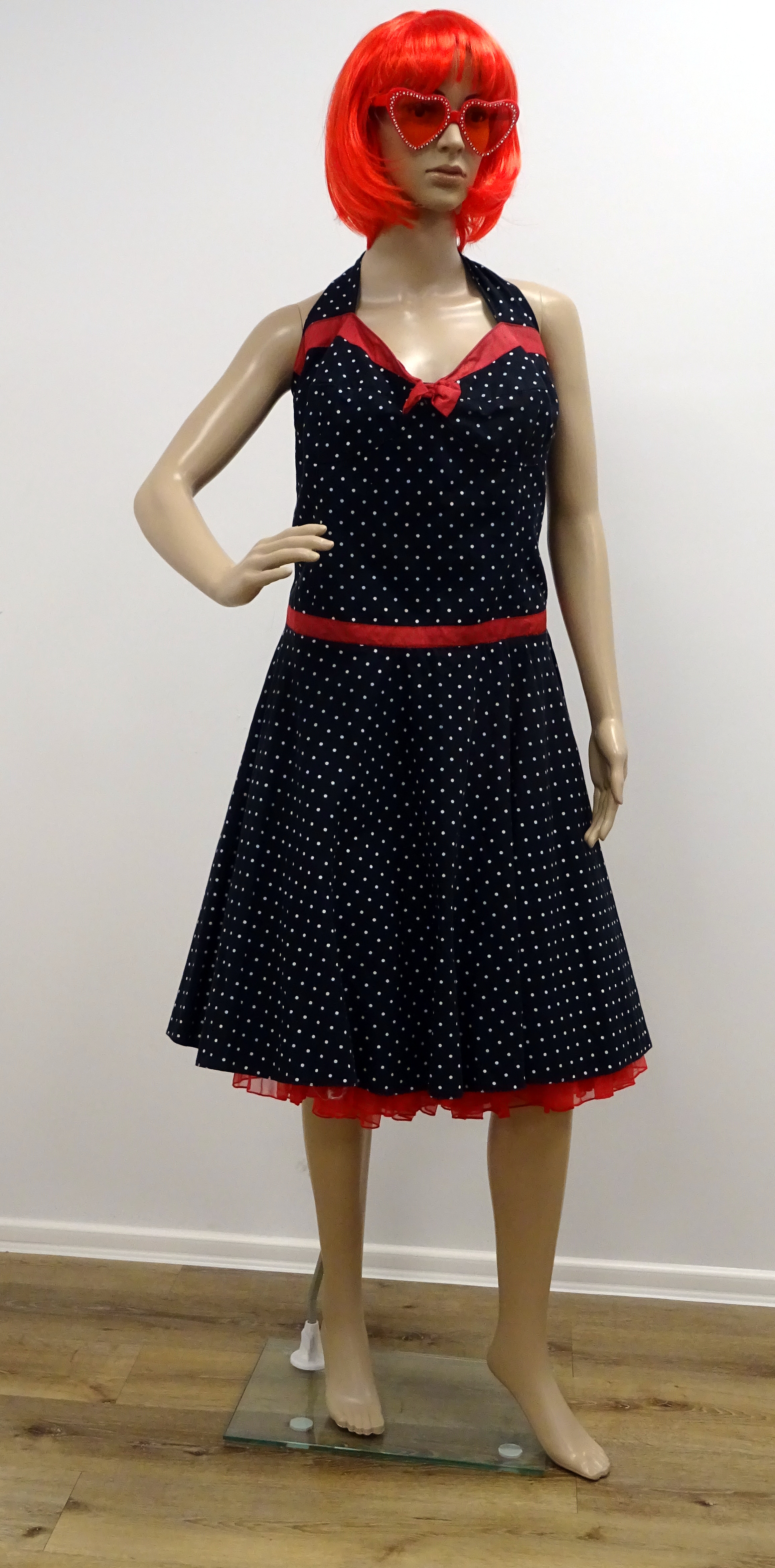 Corsagenkleid: schwarz mit weißen Punkten, rot abgesetzt (Innenfutter rot)