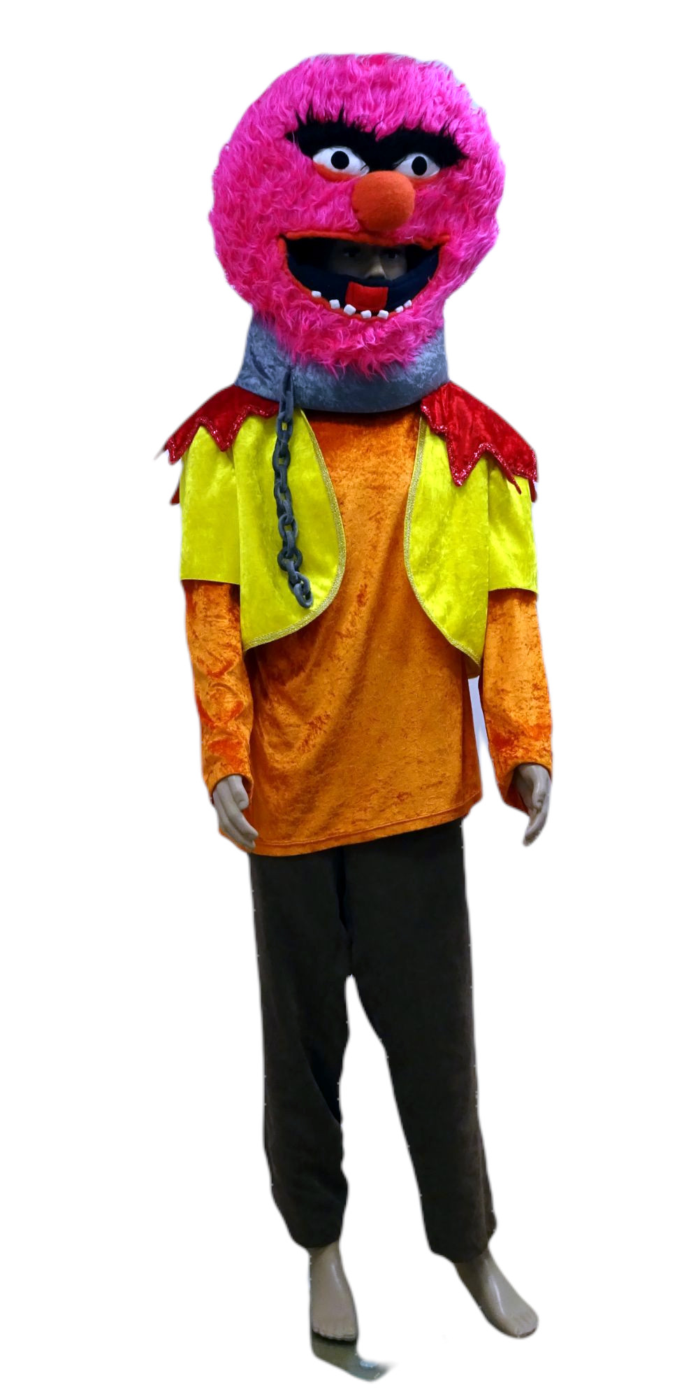 Das Tier Kopfteil , braune Hose oranges Shirt, gelb-rote Weste