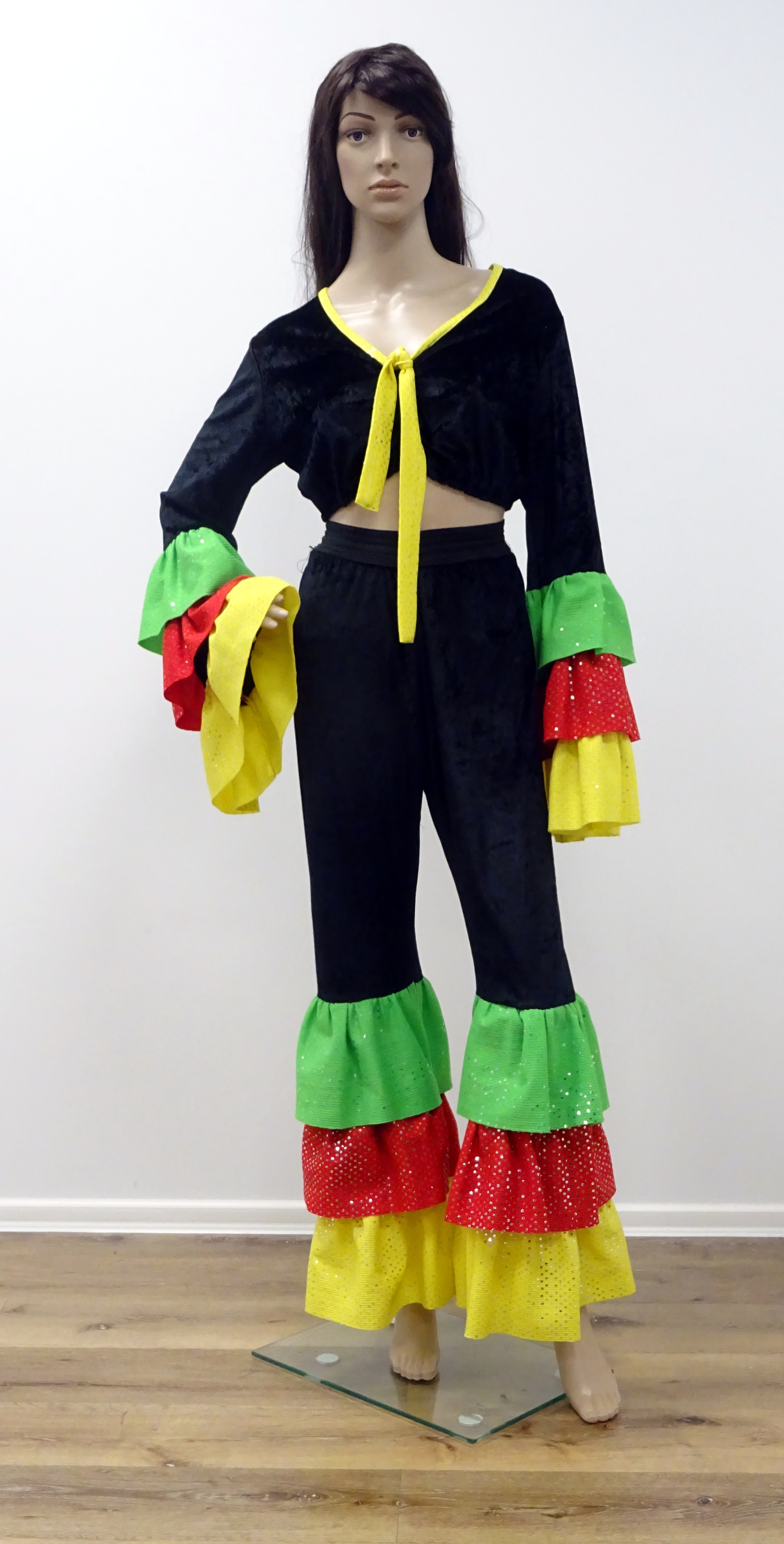 Discoanzug mit Rüschen(Oberteil, Gürtel, Hose), schwarz-bunt