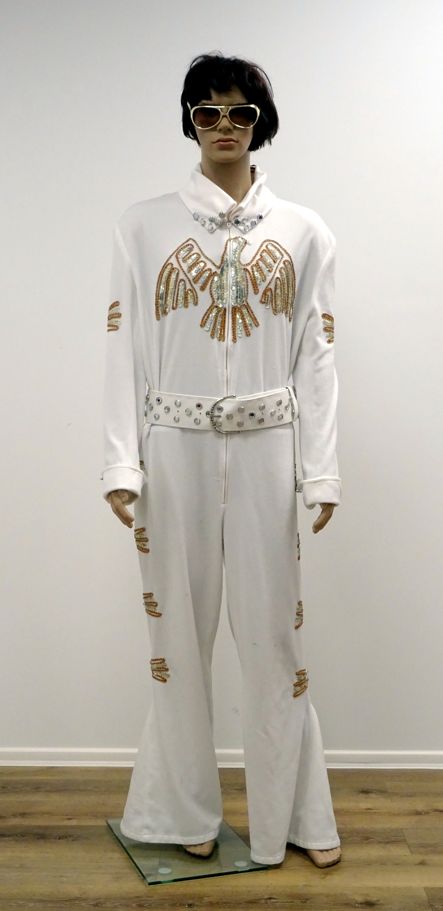 Elvis: Overall mit Strass- und Goldverz., breiter Gürtel, weiß. Weitere gleiche Artikel E431-E433