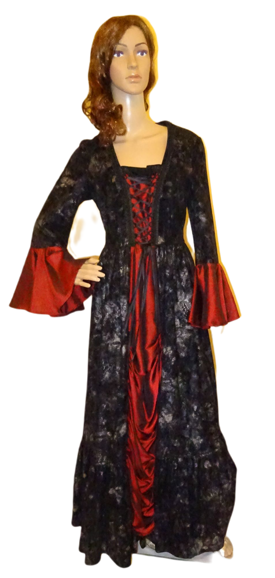 Empire/Directoire: 1-tlg. Schnür-Kleid Countess, schwarz-silber, Mittelteil dunkelrot. Weitere gleiche Artikel COU491-COU493