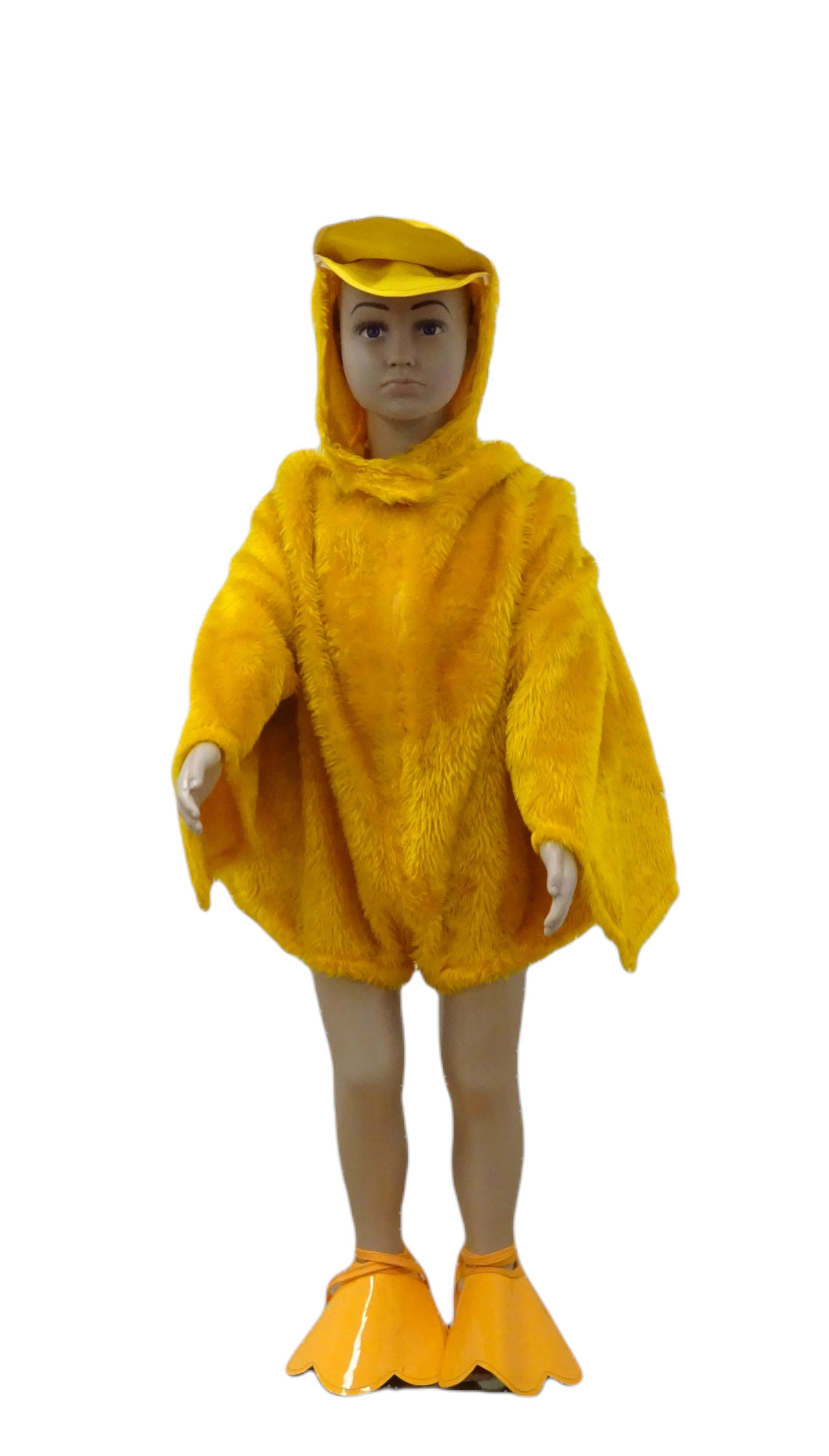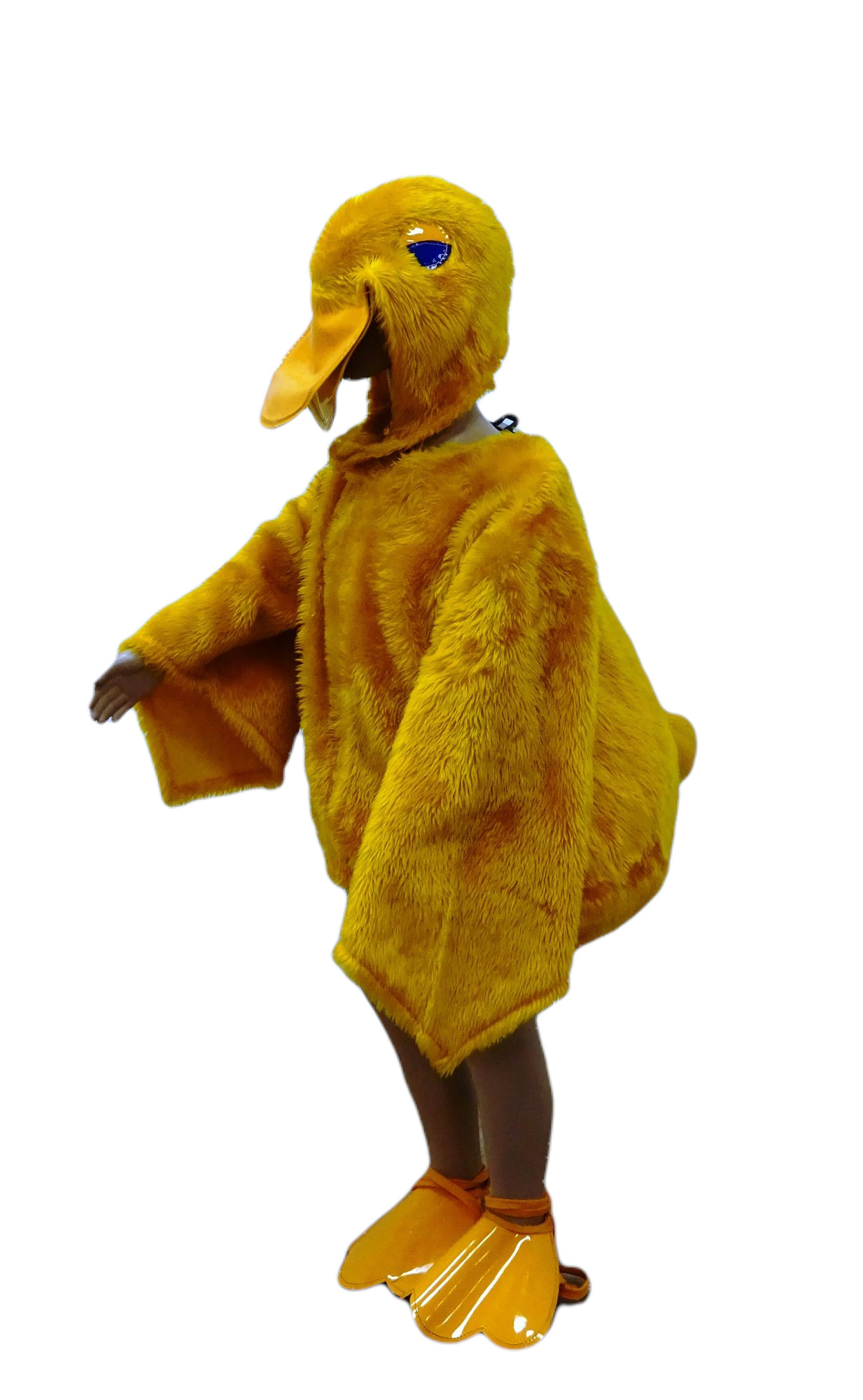 Ente: Anzug, 1 Paar Entenfüße, angesetzte Kopfmütze mit Schnabel / dottergelb. Weitere gleiche Artikel E026, E052