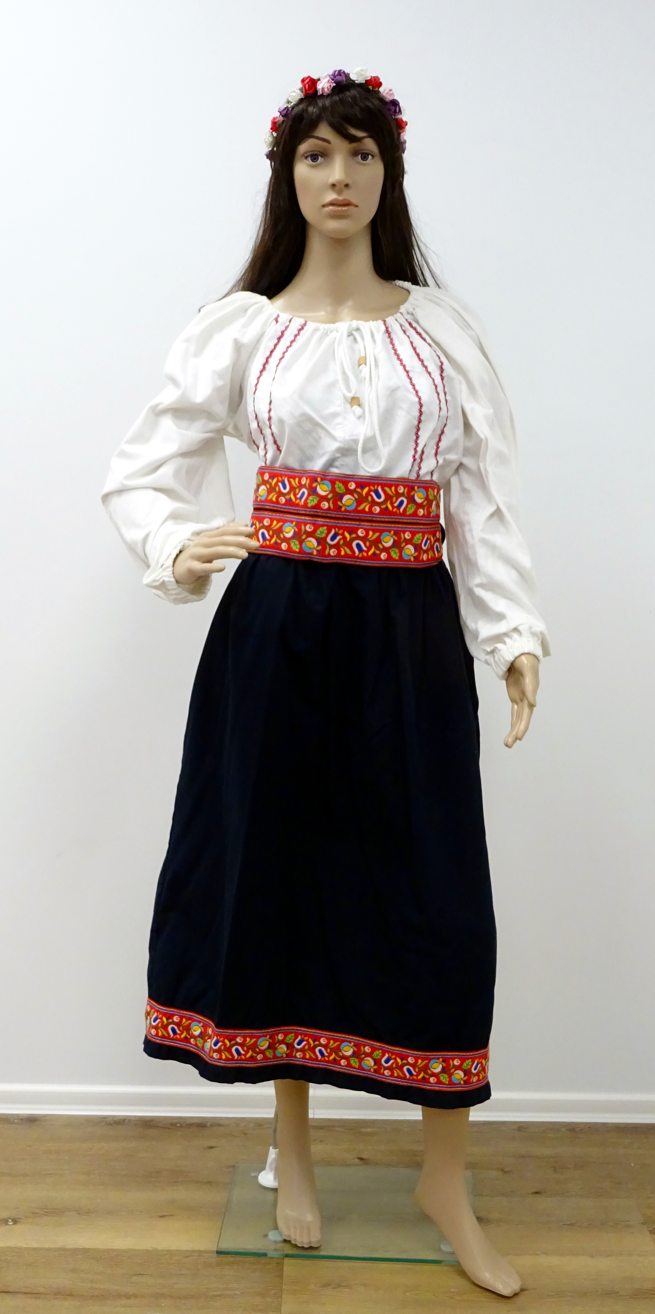 Folklore: Rock, Bluse, Gürtel (mit Borte weiß-bunt), dunkelblau