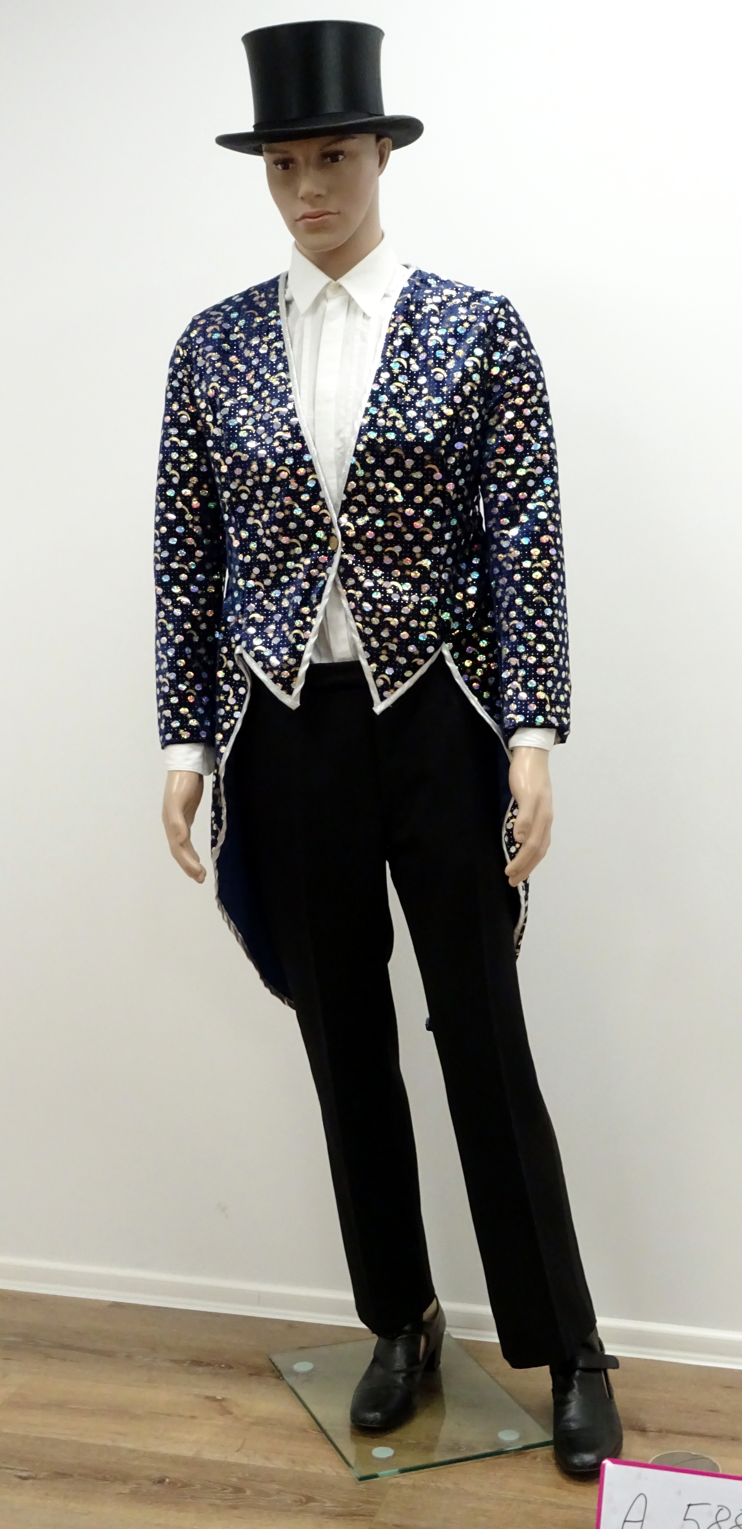 Frack, dunkelblauer Pannesamt, gold-silber aufgetragenes Muster