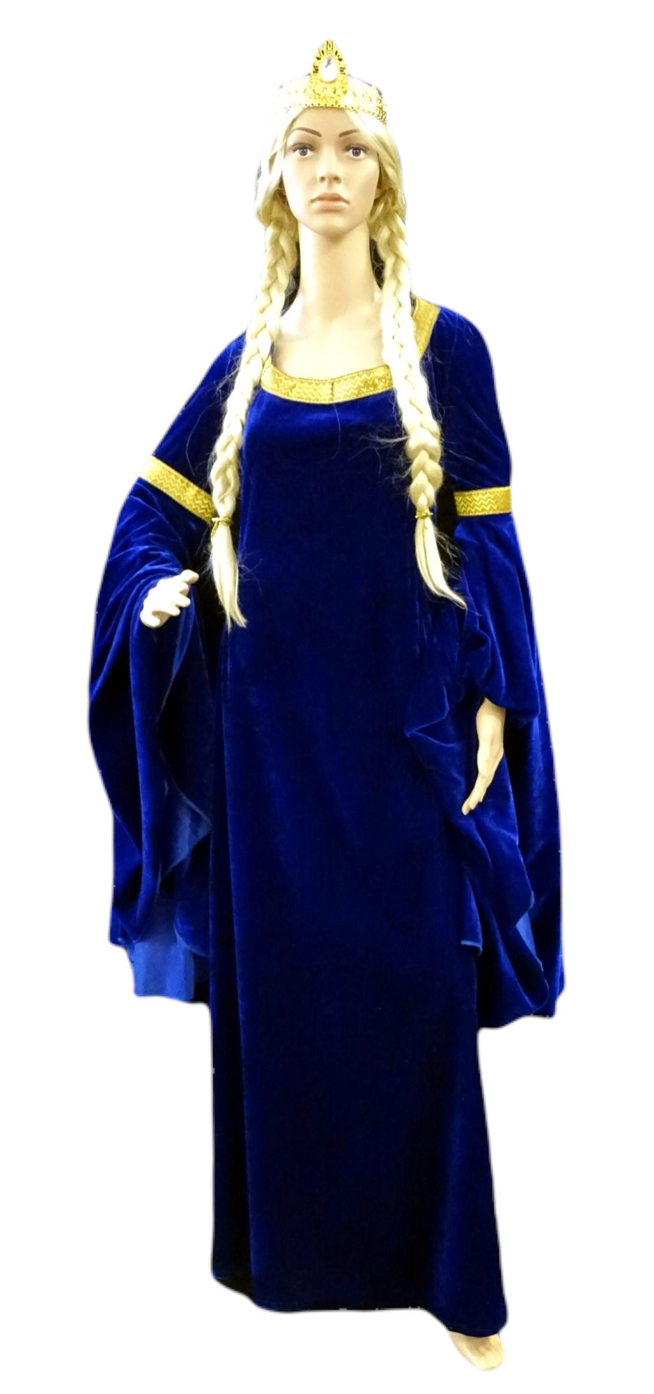 Frau aus dem Mittelalter: blauer Samt Gewand lang mit sehr weiten Trompetenärmeln. Weitere gleiche Artikel M11301