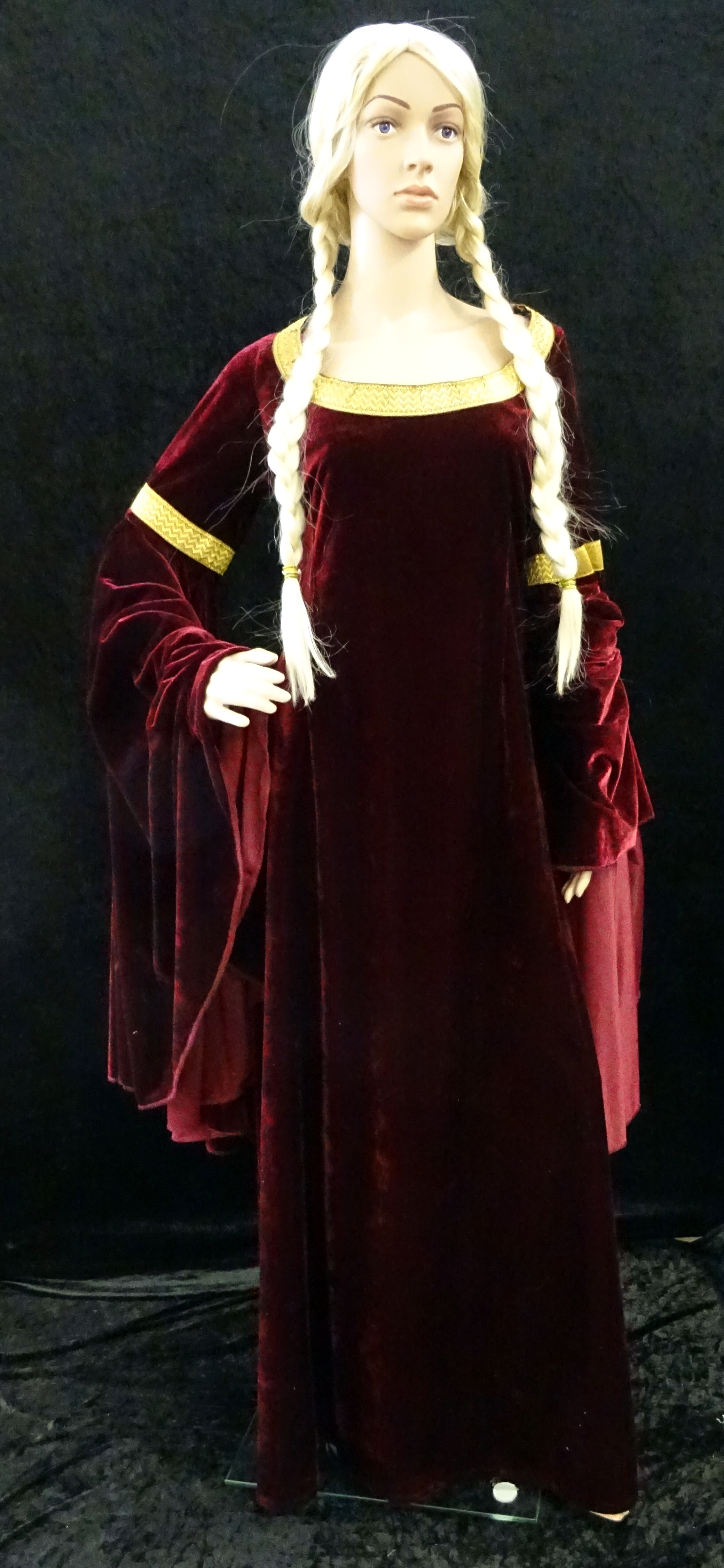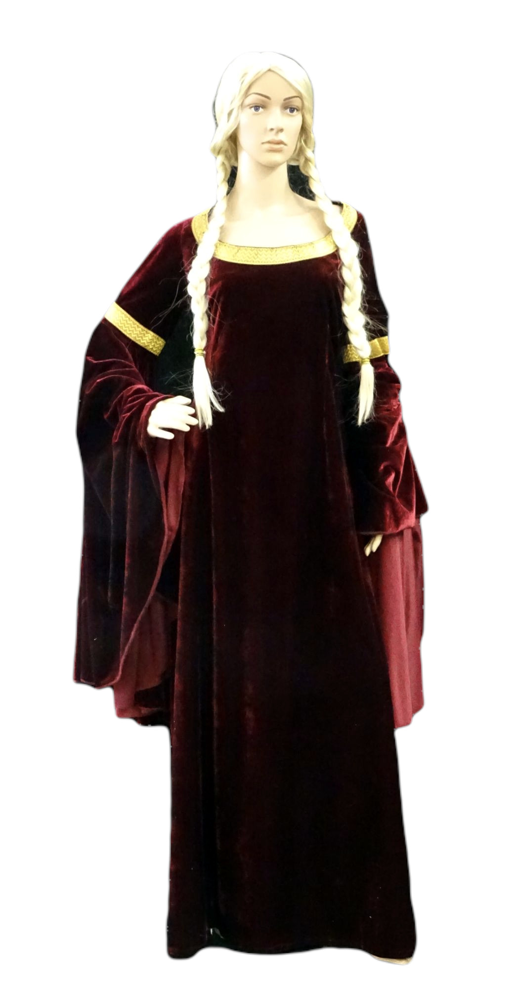 Frau aus dem Mittelalter: bordeauxroter Samt, Gewand lang mit sehr weiten Trompetenärmeln. Weitere gleiche Artikel M11302