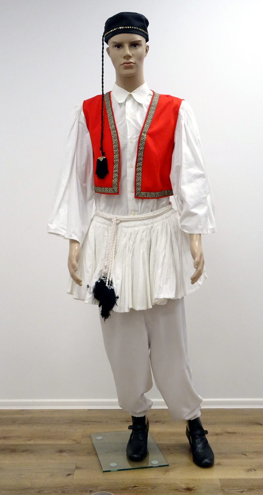 Grieche „Sirtaki“: weißes Hemd, weißer Rock, rote Weste, schwarzer Hut, 2 weiße Kordeln. Weitere gleiche Artikel S261-S269