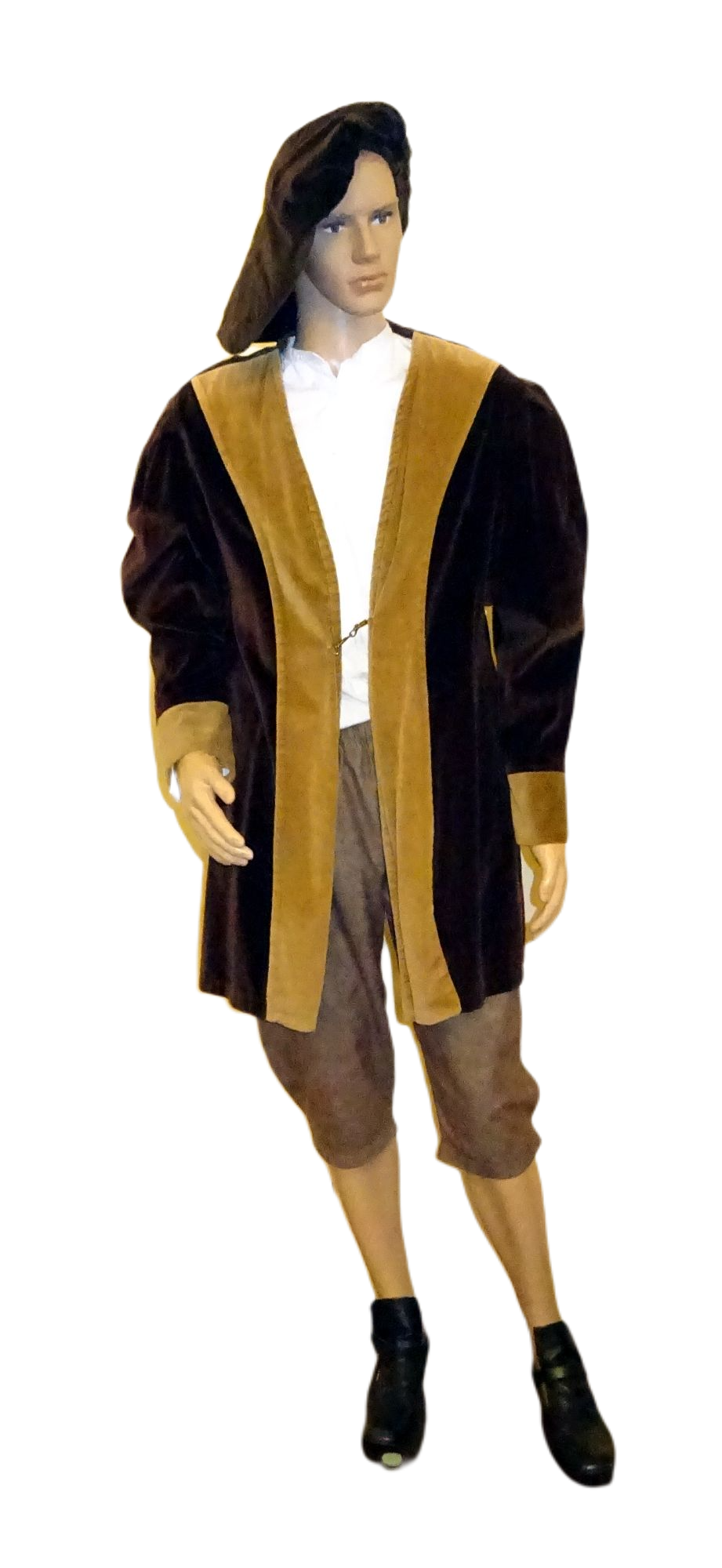 Gutenberg: Jacke, Kniebundhose, Barett, braun mit buntem Revers