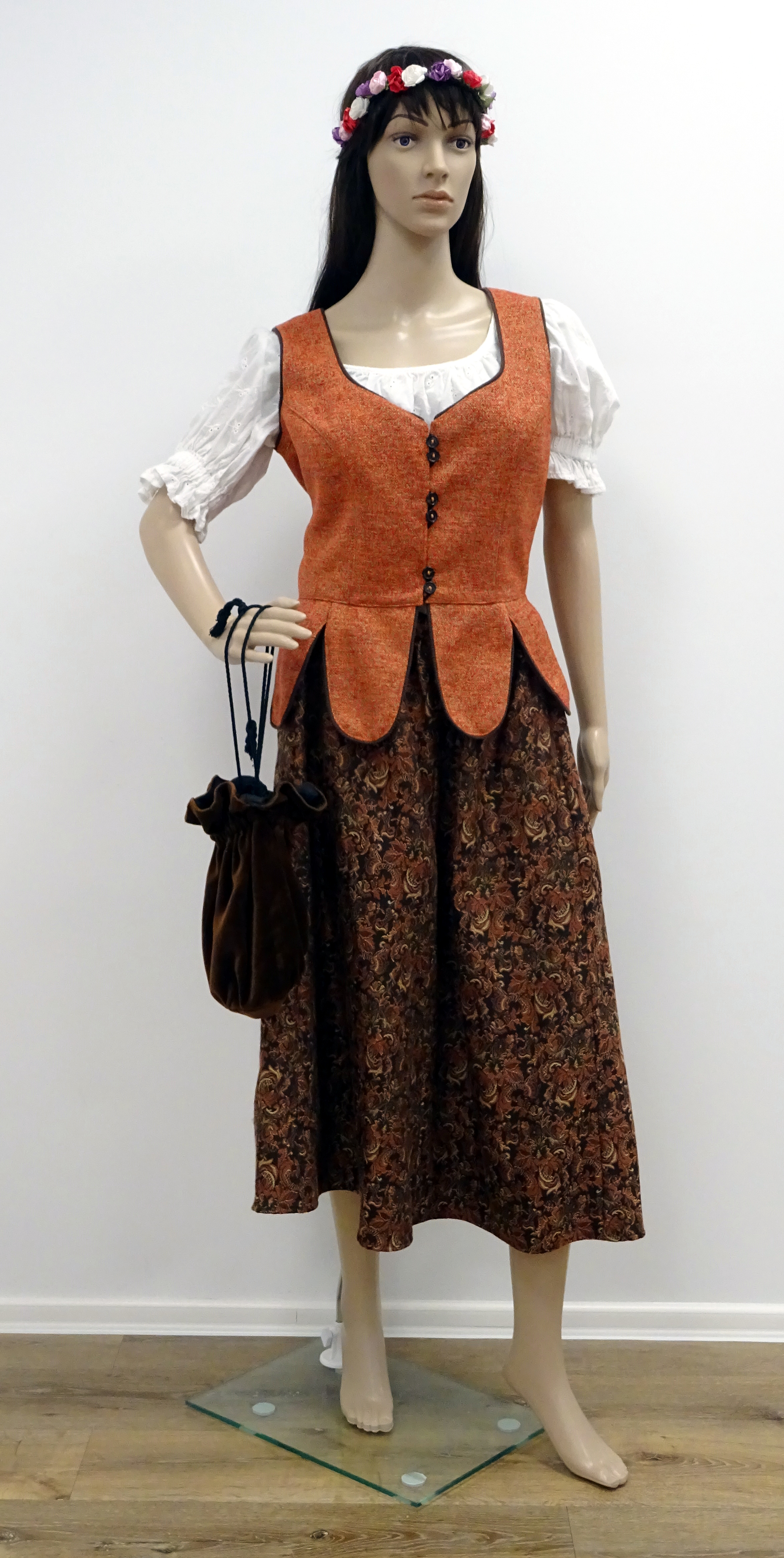 historische Marktfrau; weiße Bluse, 2-lagiger Rock(gemustert), rostfarb. Weste, -rost-dunkelblau. Weitere gleiche Artikel M761-M766