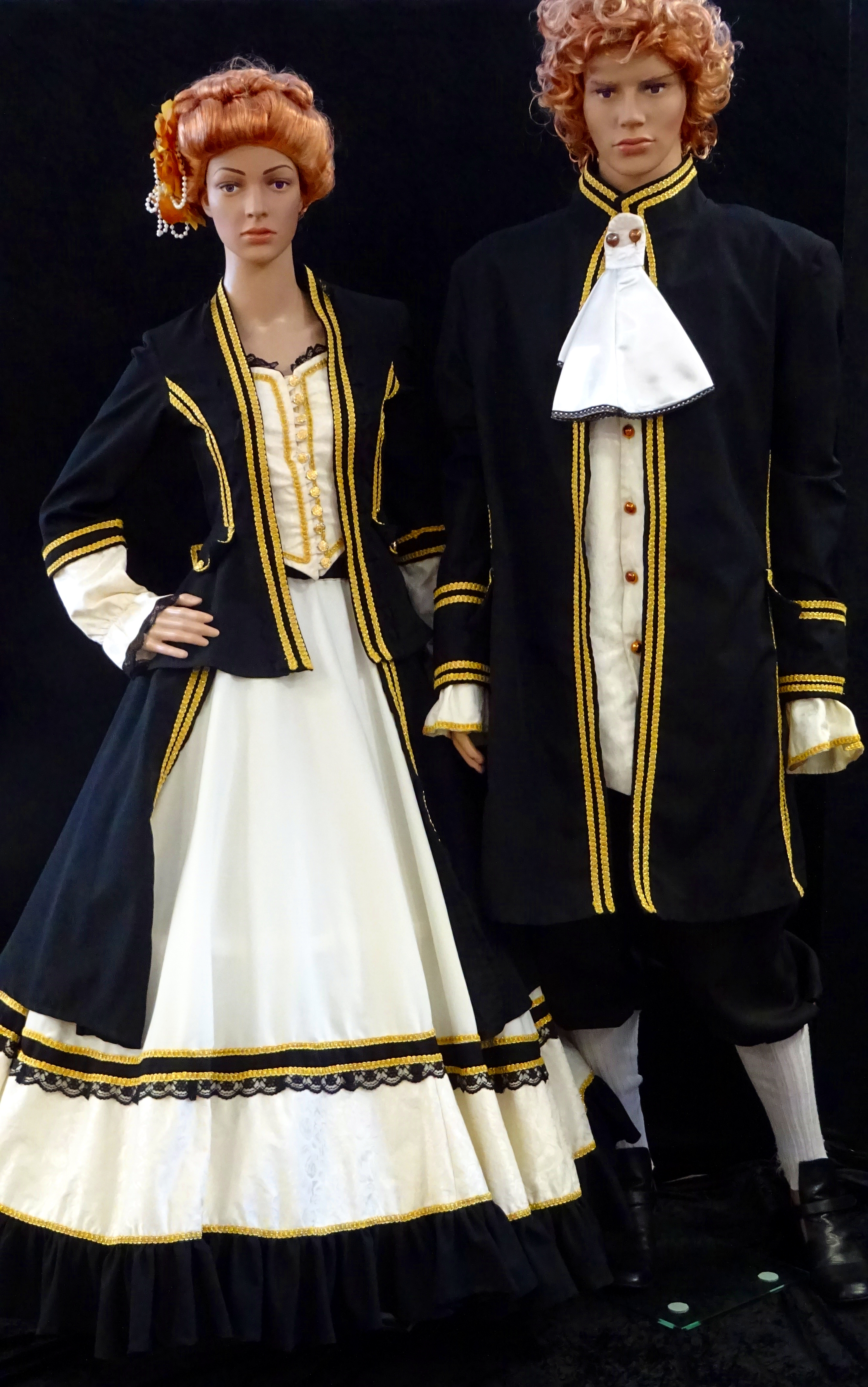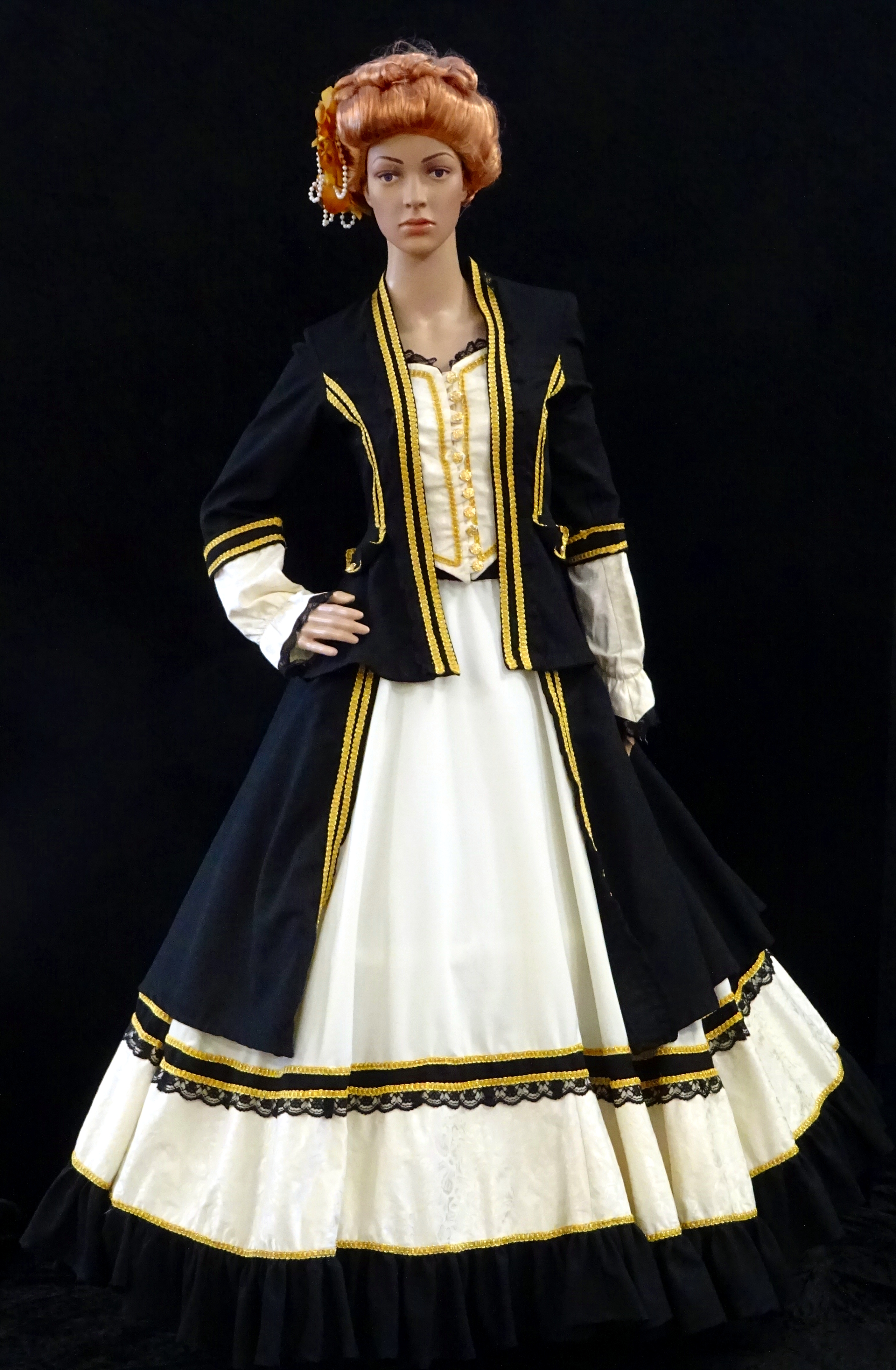 Justine: 2-teiliges Kleid mit eingesetztes Westenteil (Verzierung mit Goldborte), schwarz-creme. Weitere gleiche Artikel J132, J134