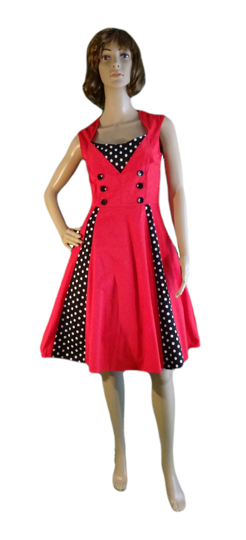 Kleid rot mit schwarz/weiß gepunkteten Einsätzen. Junioren/Erwachsene