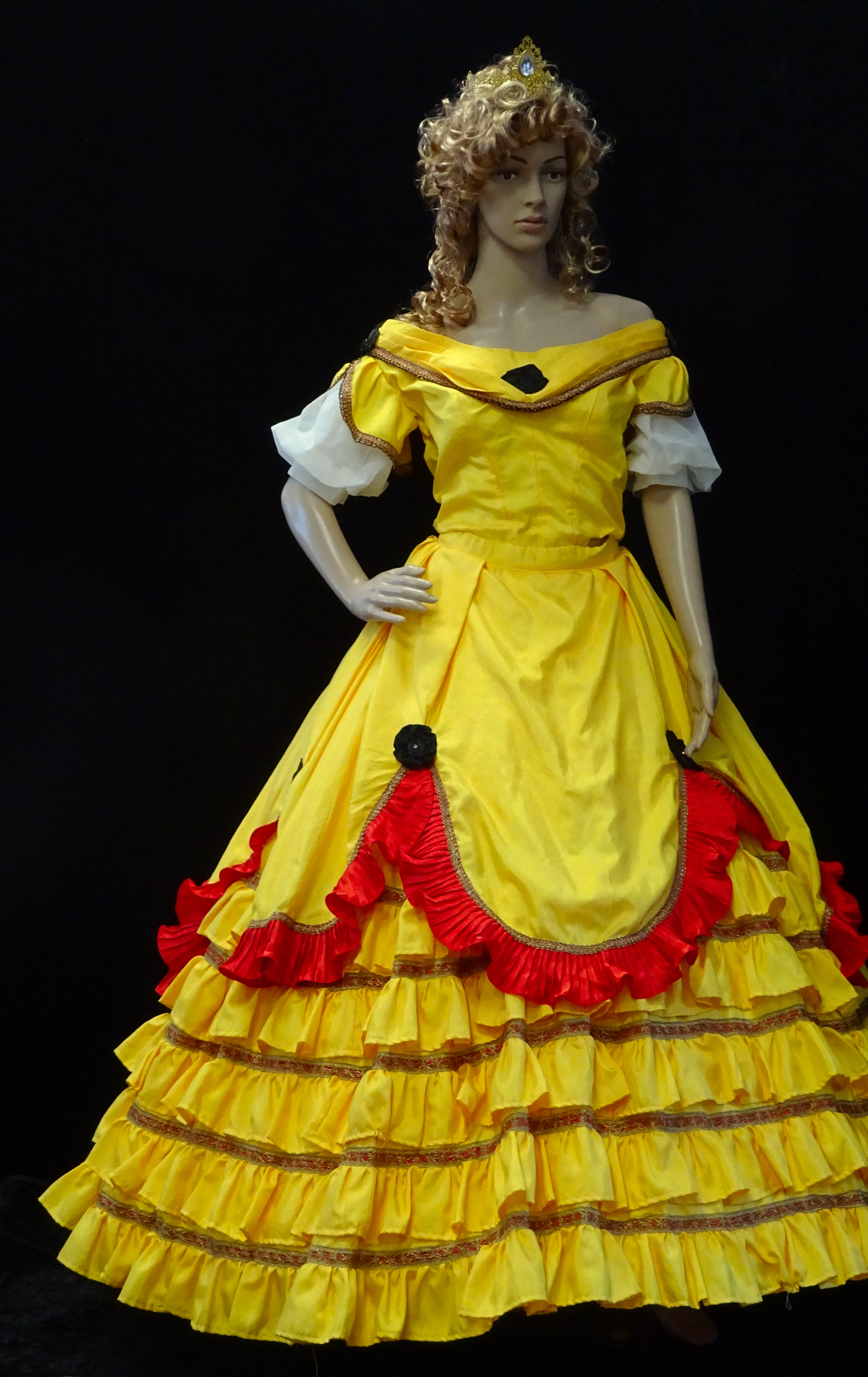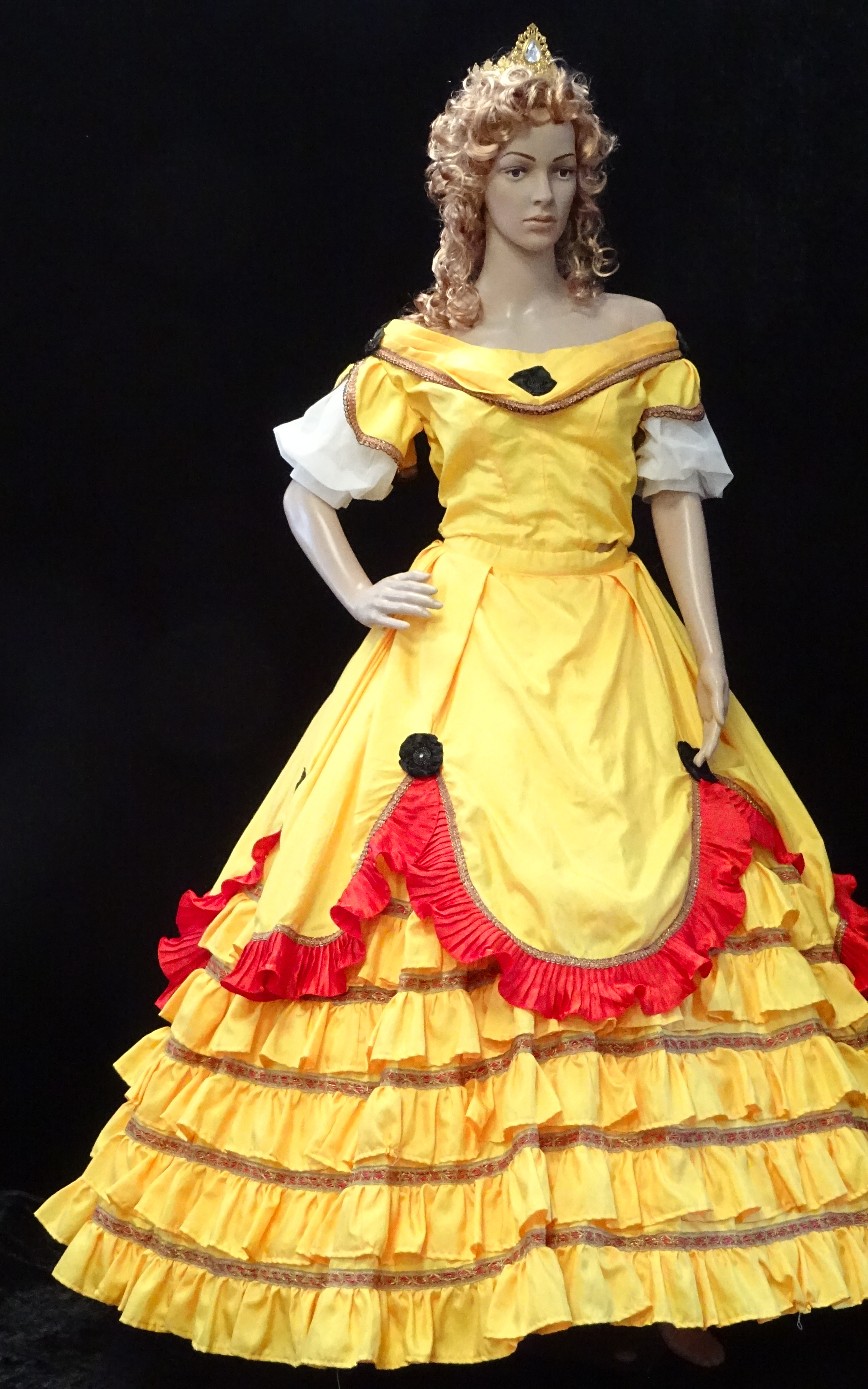 Kleid Sissi: Oberteil und Rock, goldgelb mit roter Rüsche, schwarze Blüten, rot-goldene Borte