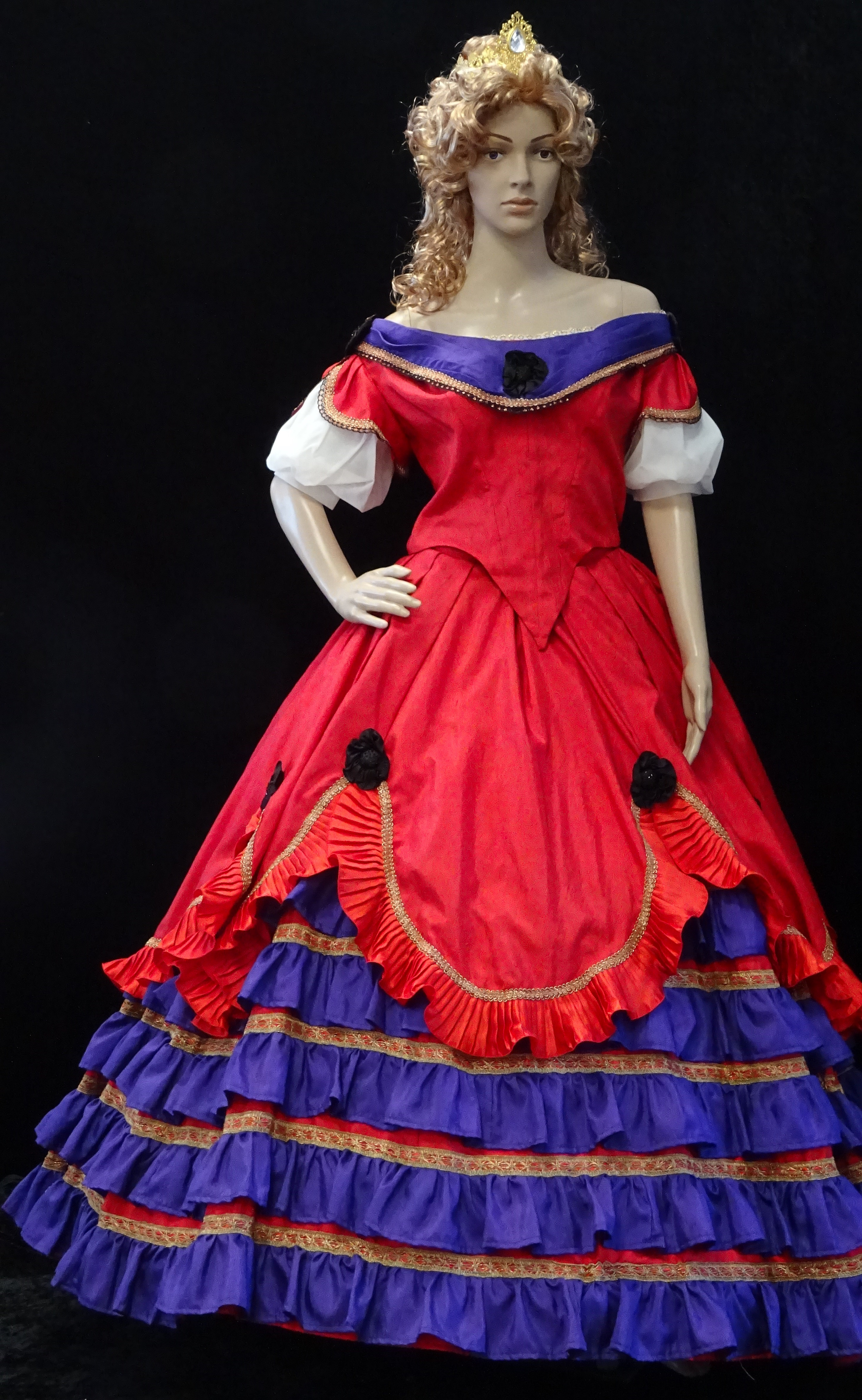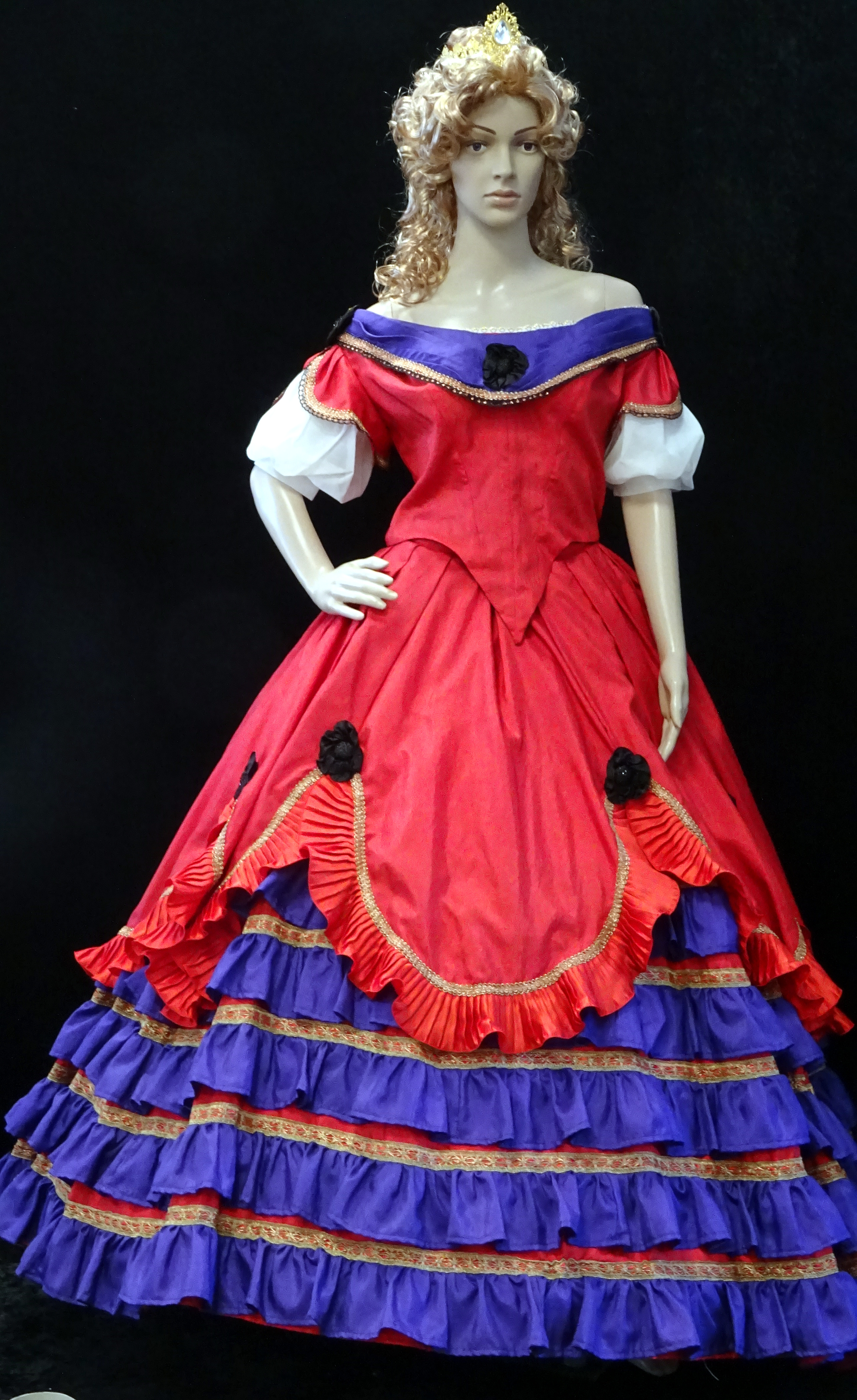 Kleid Sissi: Oberteil und Rock, rot mit roter Rüsche, Ausschnitt und unterer Volantrock lila, schwarze Blüten, rot-goldene Borte