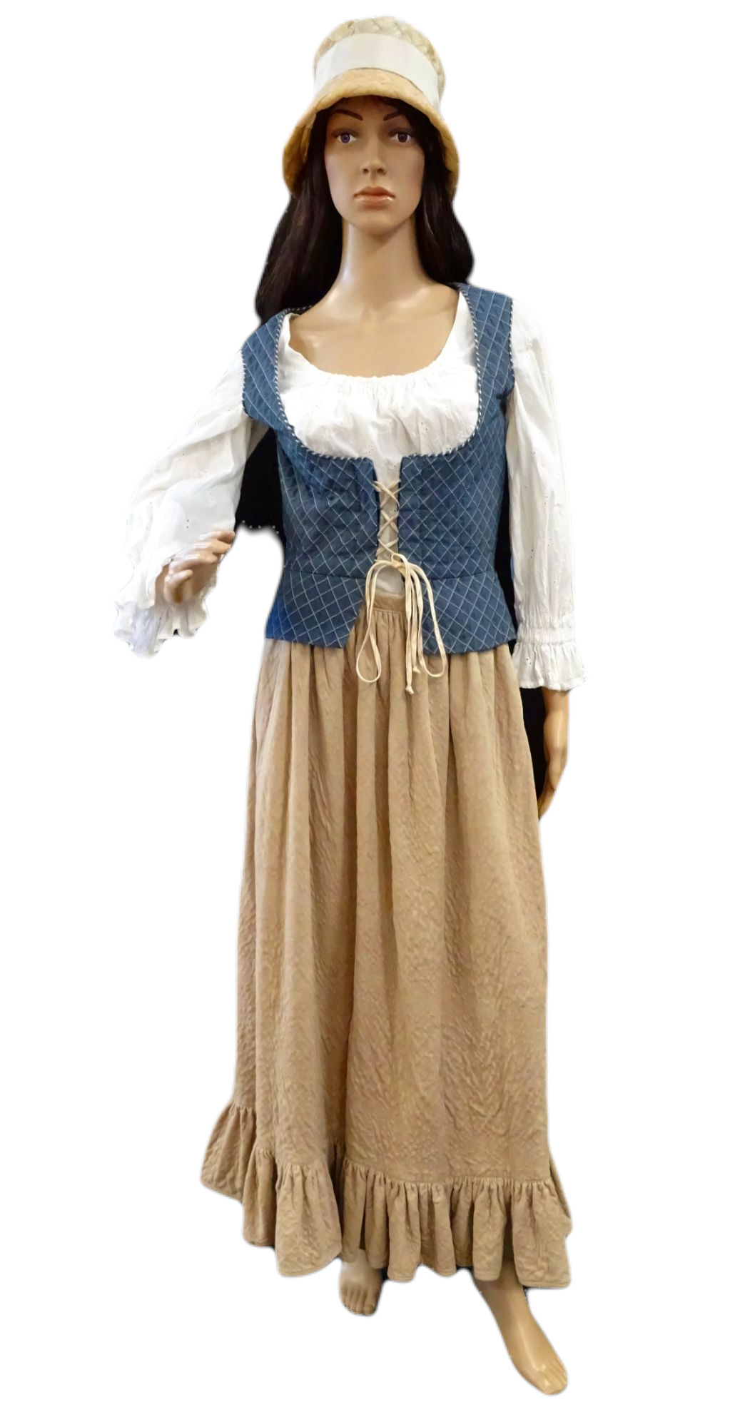 Marketenderin: beiger Rock, weiße Bluse, blau-karierte Weste. Weitere gleiche Artikel M511-M518