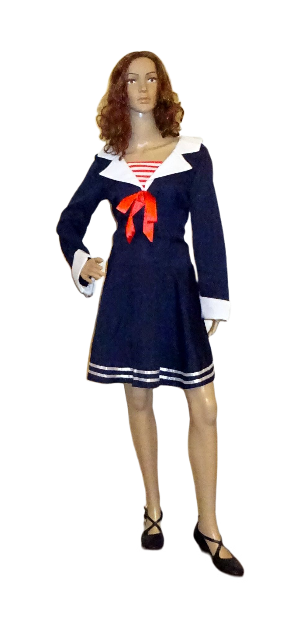 Matrosenkleid, dunkelblau, weißer Kragen, rot-weißer Ausschnitt, rote Schleife