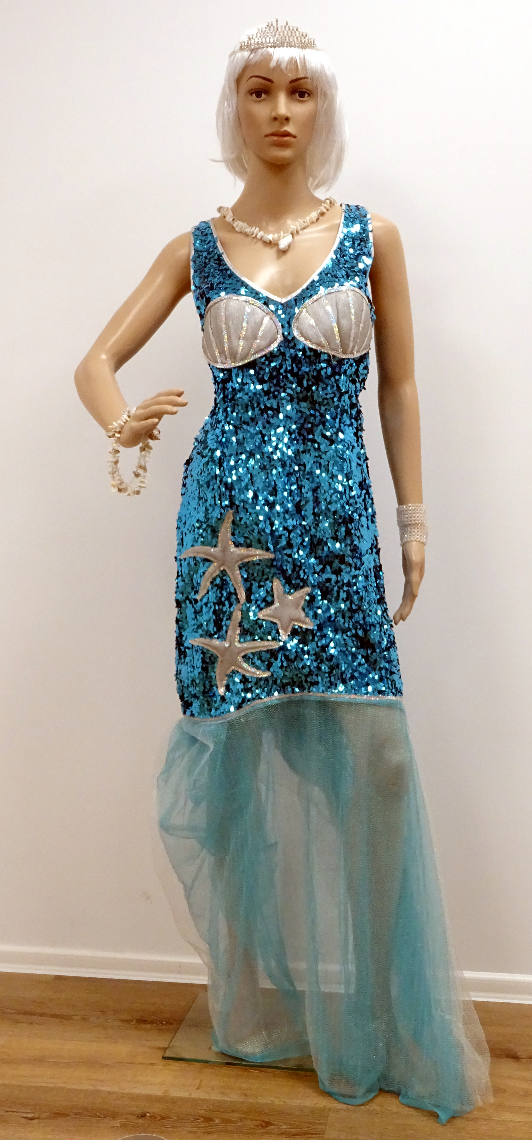 Meerjungfrau; langes blaues Pailettenkleid (unten silber blauer Tüllansatz) . Weitere gleiche Artikel N166, N190