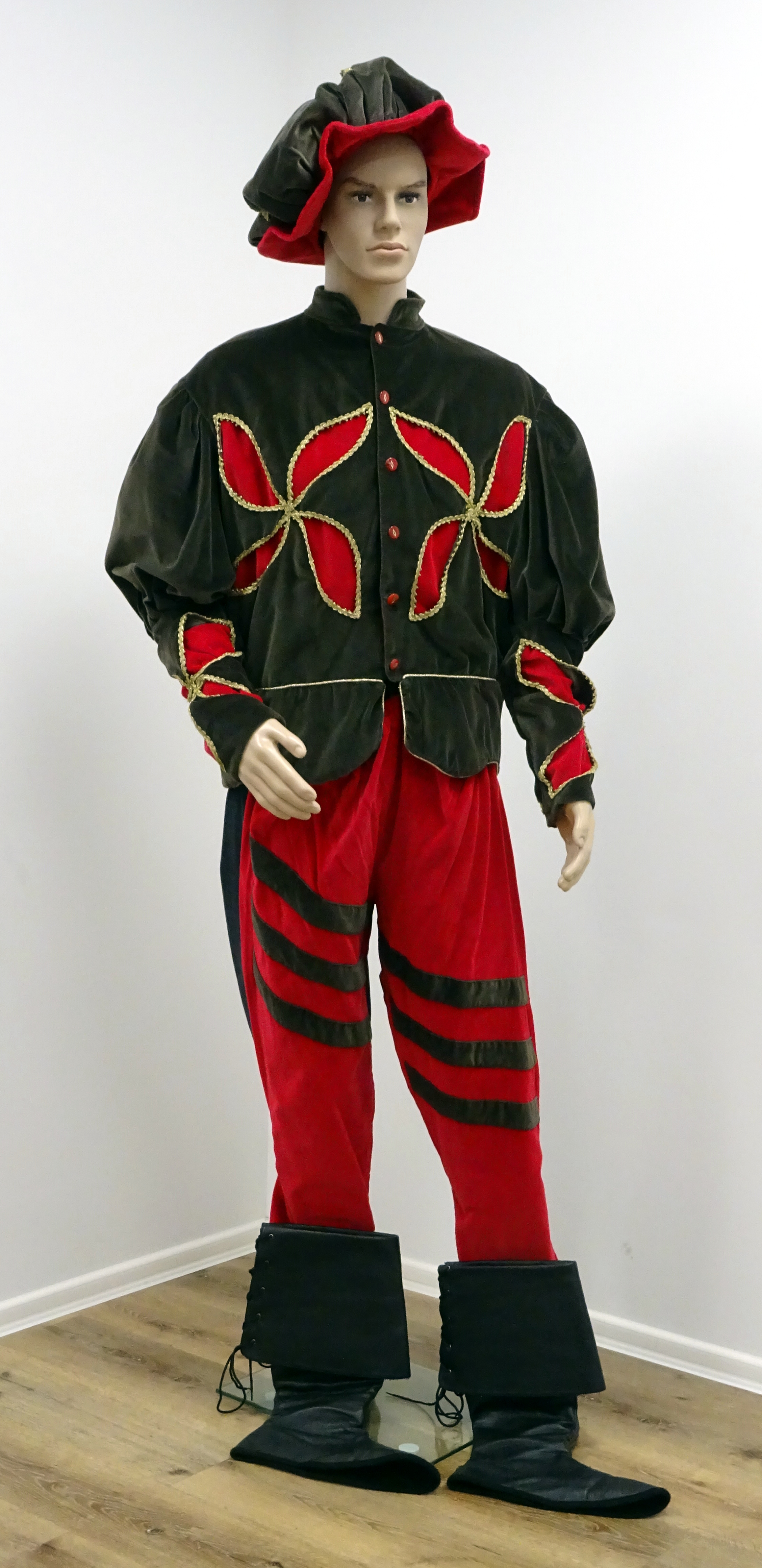 Minnesänger: Jacke, Hose, Mütze, Stiefel, grau-rot