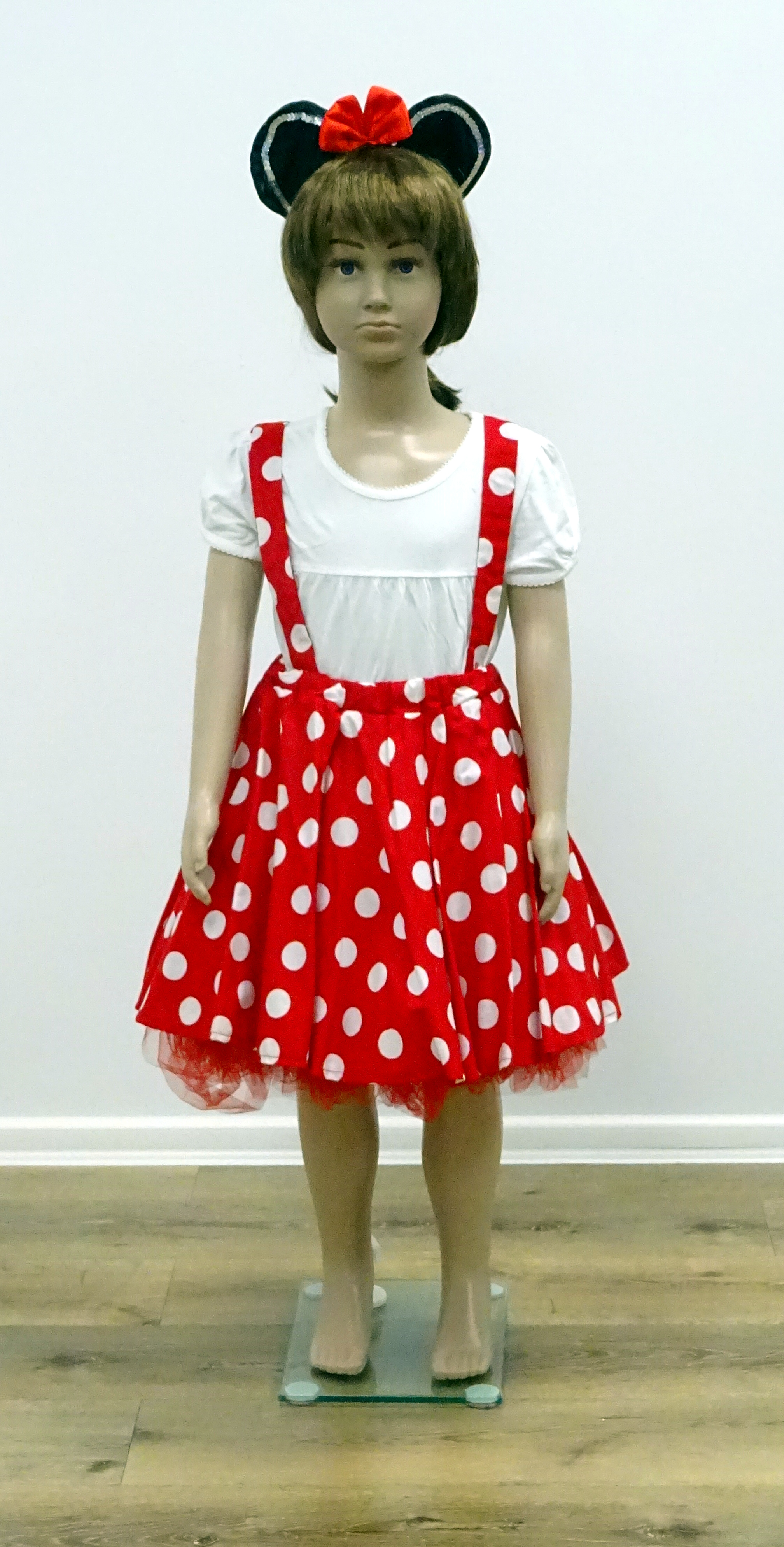 Minnie- Mouse, Trägerkleid mit Ohrenkappe, rot-weiß-gepunktet. Weitere gleiche Artikel M541-M579