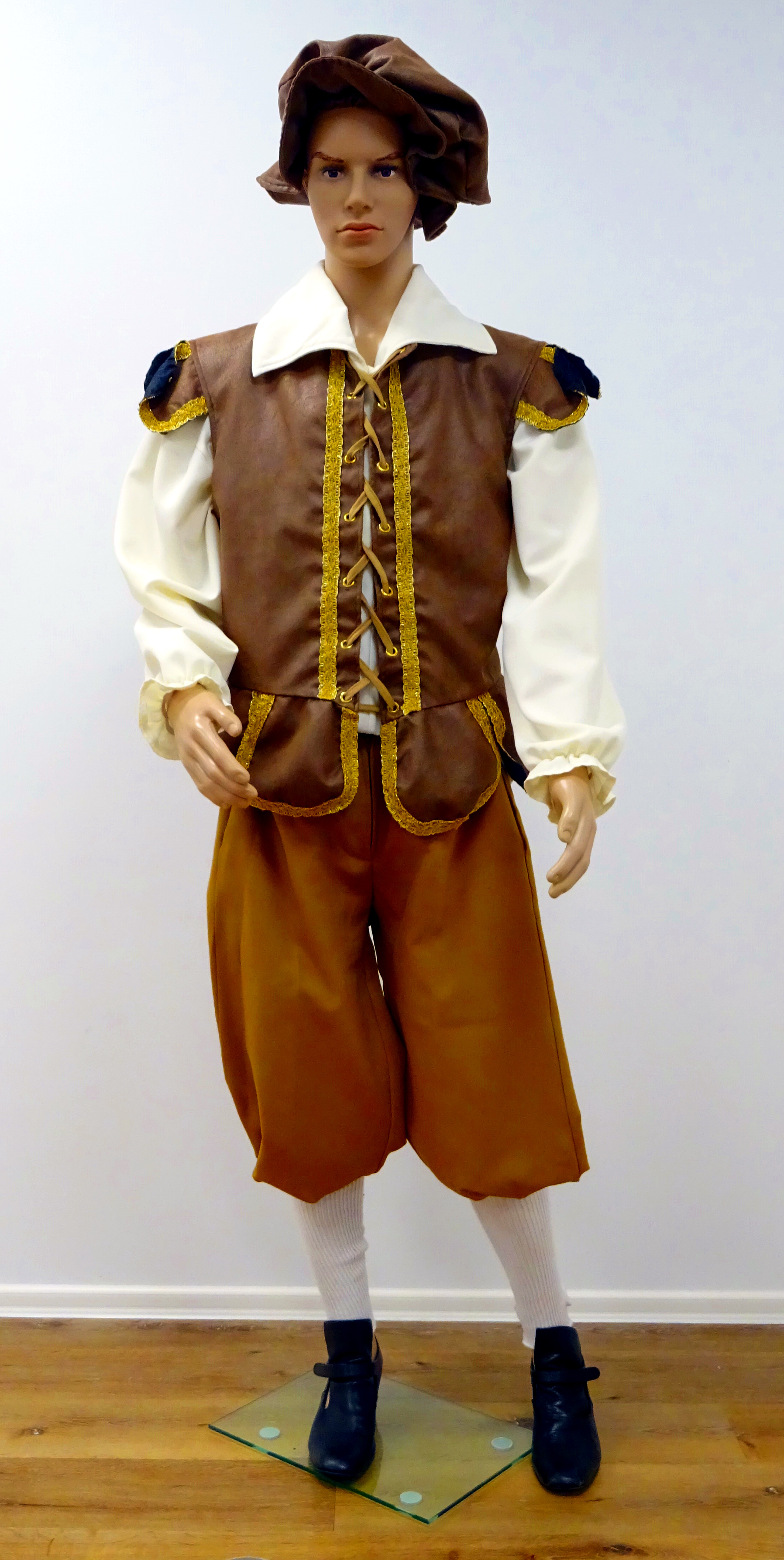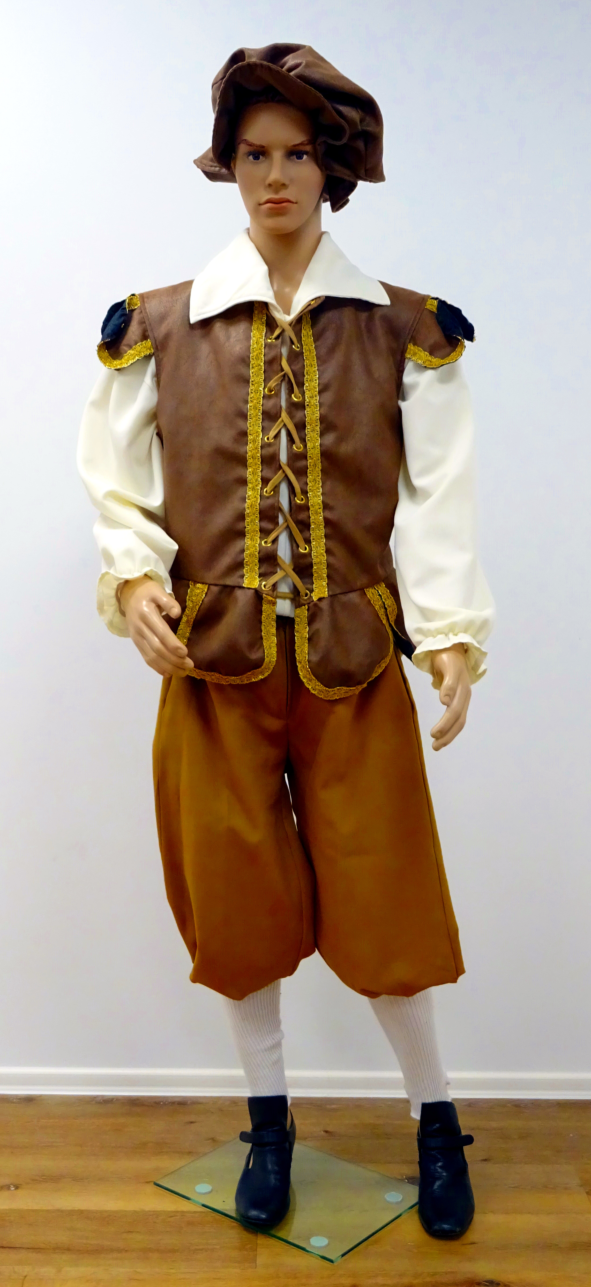 Mittelalterlicher Herr, 3/4 Hose beige, Hemd, Mütze, Weste mit Goldlitze, braun beige gold. Weitere gleiche Artikel M1142-M1149