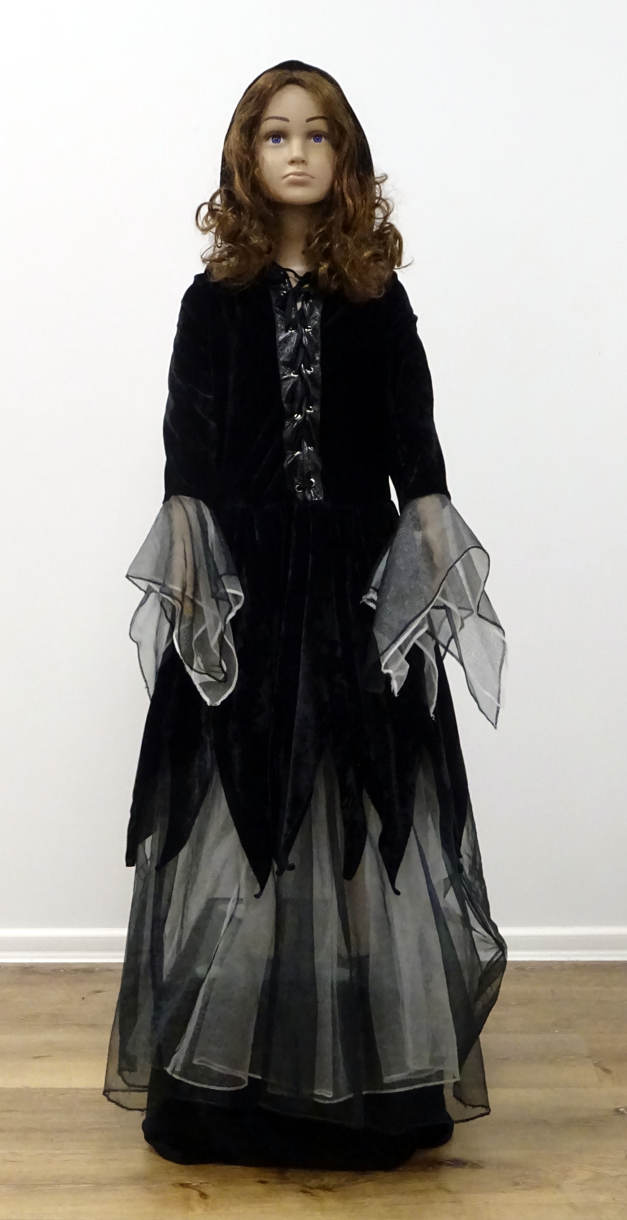 Mittelalterliches langes Kleid, Samt, schwarz, mit Kapuze, mit Tüll, Kinderkost. Weitere gleiche Artikel KI009, KI010, KI019