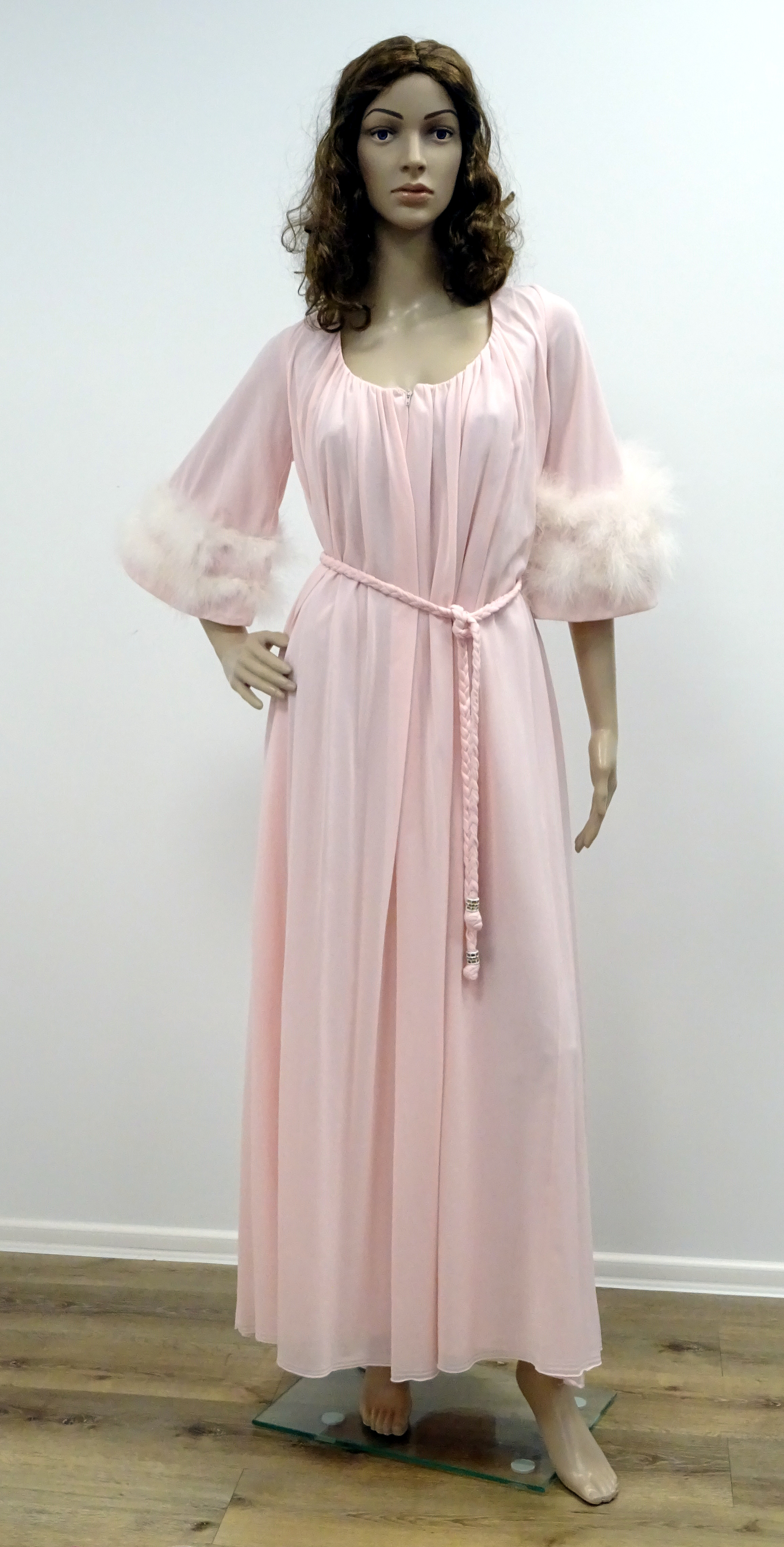 Morgenkleid, lang, mit Pelzärmeln, rosa
