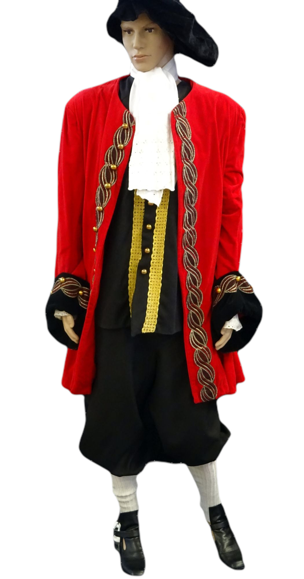 Piratenkapitän/Admiral:roter Gehrock, schw. Weste, Hose,w. Schal, rot. Weitere gleiche Artikel A177