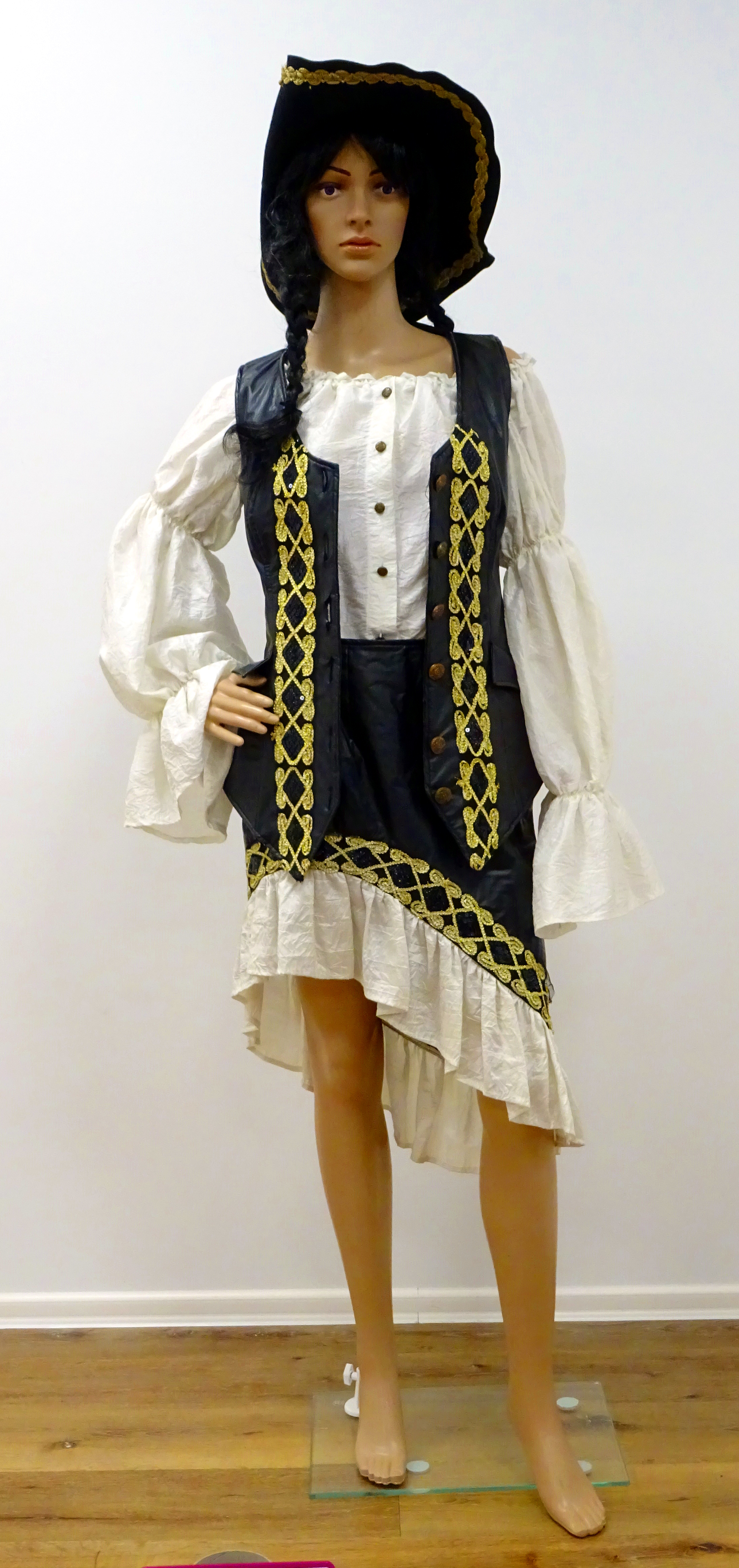 Piratin, Lederimitat schwarz, Weste, gold bestickt, Bluse creme, Rock gold bestickt + cremefarbenen Volant