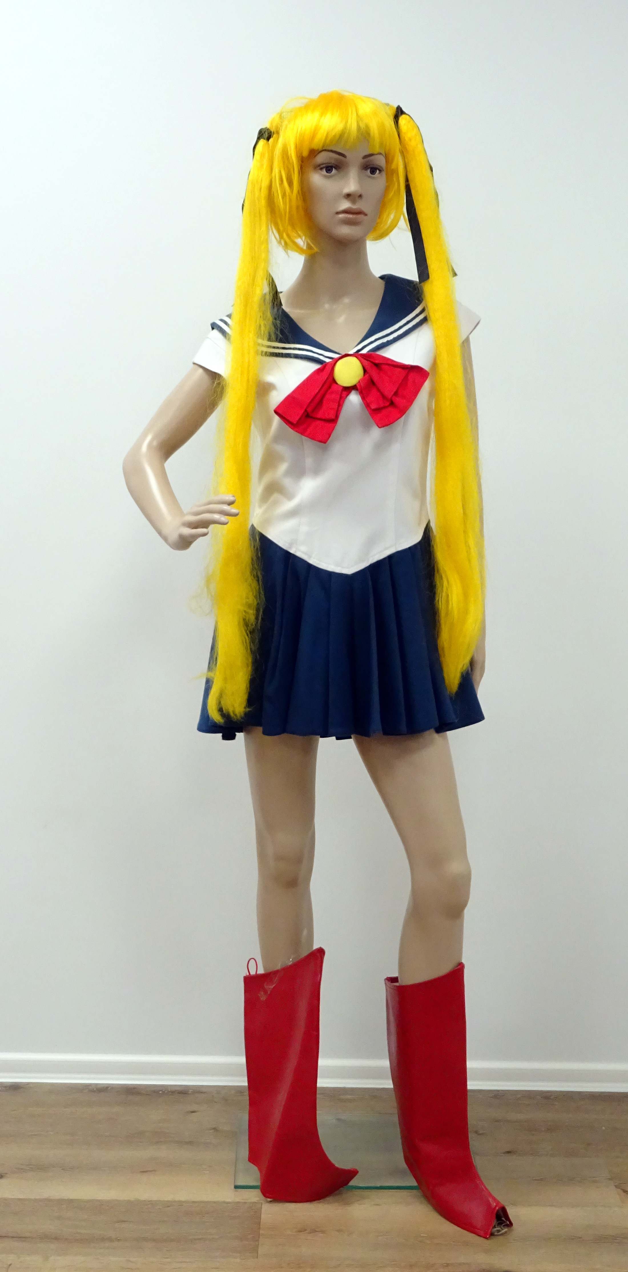 Sailormoon: Kleid Oberteil weiß mit roter Fliege, Rock blau, rote Stiefelstulpen. Weitere gleiche Artikel ST2114-ST2117