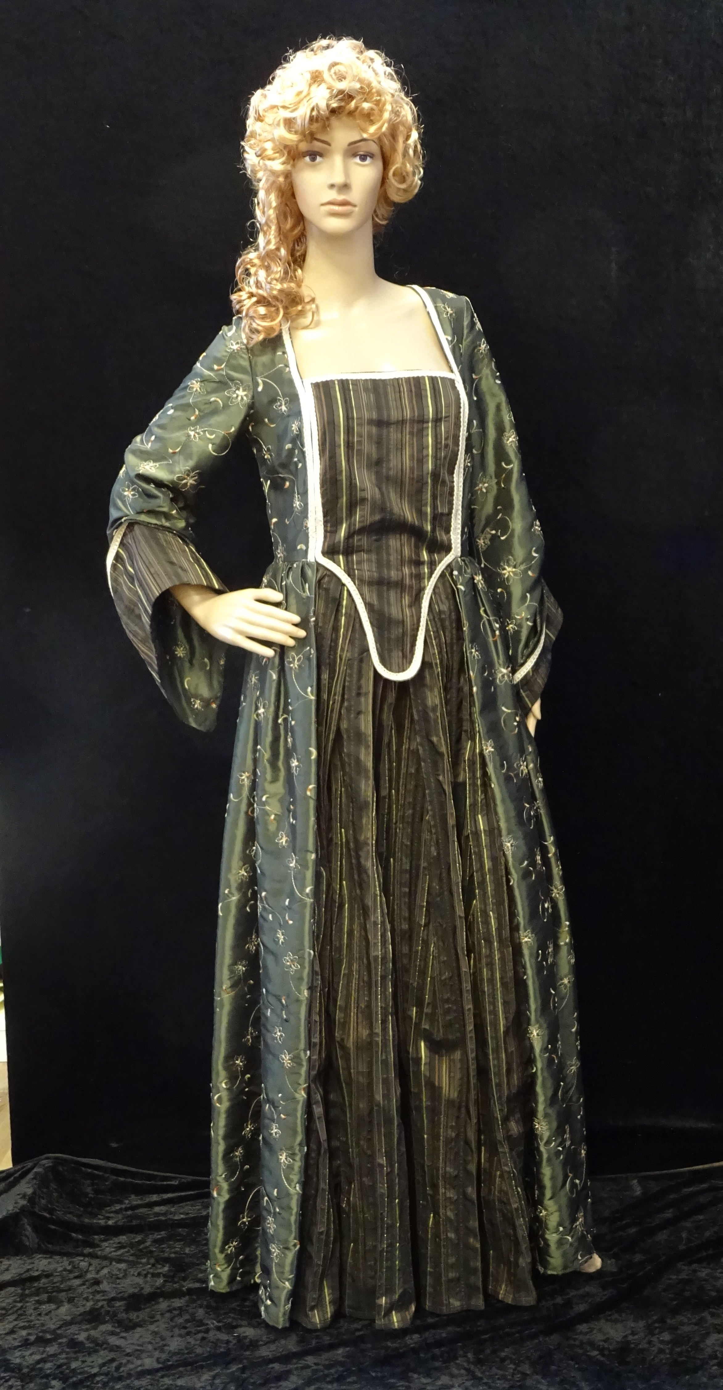 Schloßherrin: Kleid grün mit Stickerei-Einsatz Rock + Oberteil gestreift. Weitere gleiche Artikel E312-E314