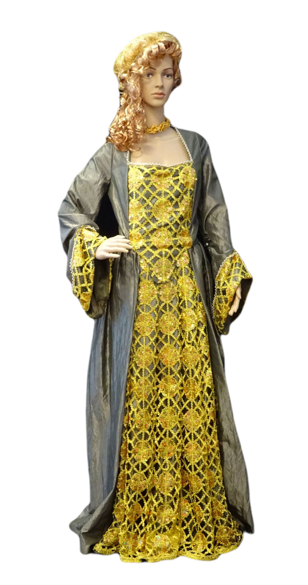 Schloßherrin: Kleid taupe mit Stickerei-Einsatz Rock + Oberteil Goldspitze mit Pailetten 4 Stück