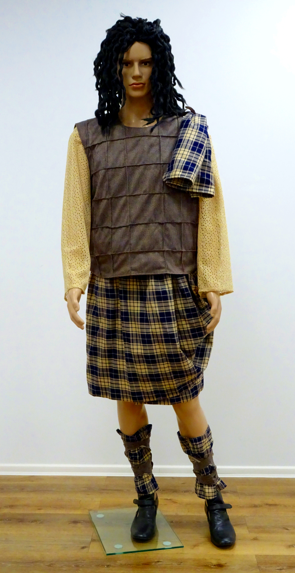 Schotte Brave Heart: Obergewand braun, Netzuntergewand beige, Rock mit angesetzter Schärpe blau-beige kariert, 2 Beinstulpen. Weitere gleiche Artikel B460-B475
