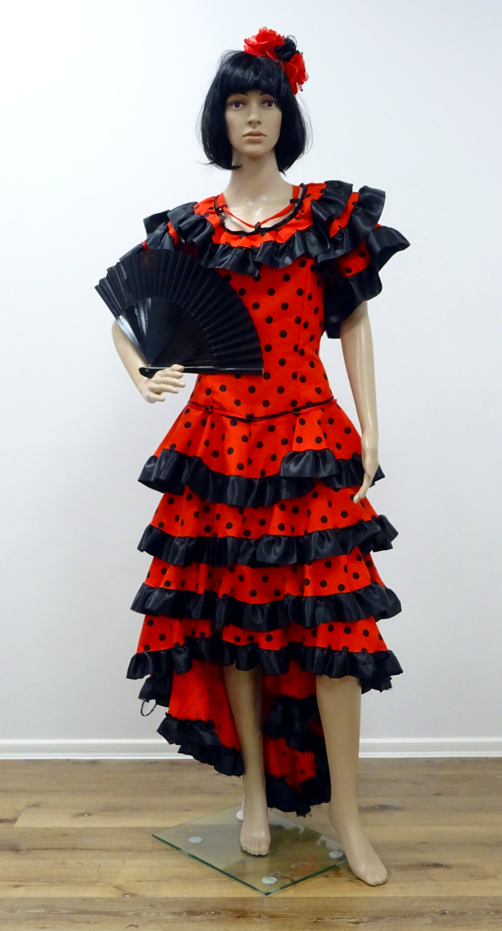 Spanierin: Kleid rot mit schwarzen Punkten, schwarz Volants. Weitere gleiche Artikel S1080-S1082, S401, S402