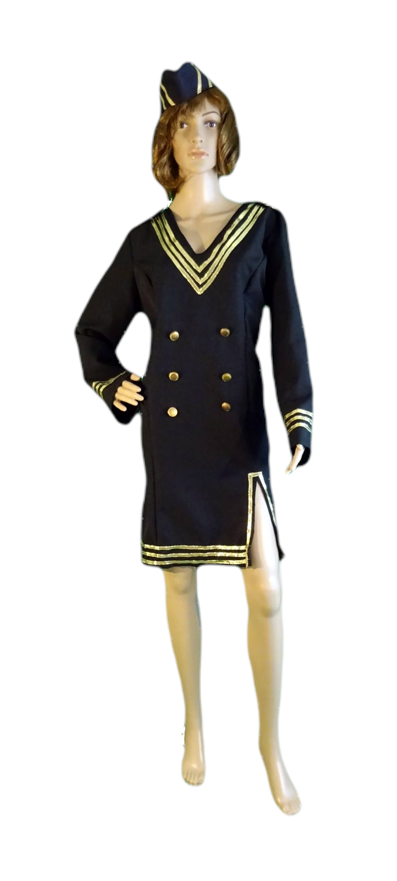 Stewardess Kleid, schwarz, Goldstreifen, goldene Knöpfe, mit Abzeichen. Weitere gleiche Artikel ST1001