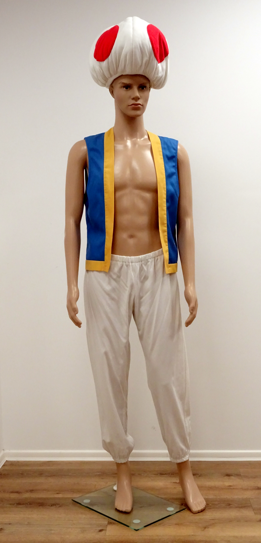 Super Pilz: weiße Hose, blaue Weste, wiße Mütze m. roten Punkten