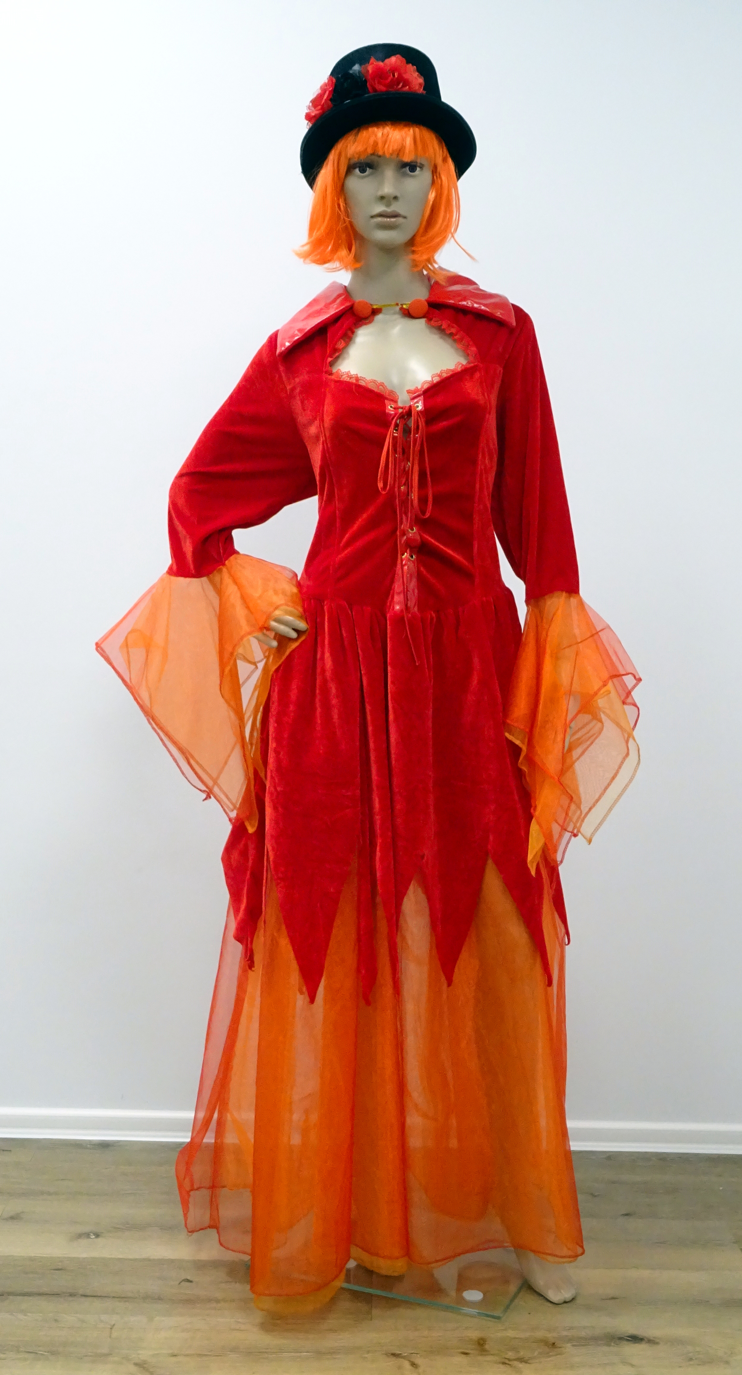 Teufelskleid, rot, Pannesamt, Tüll, Lackkragen, lang