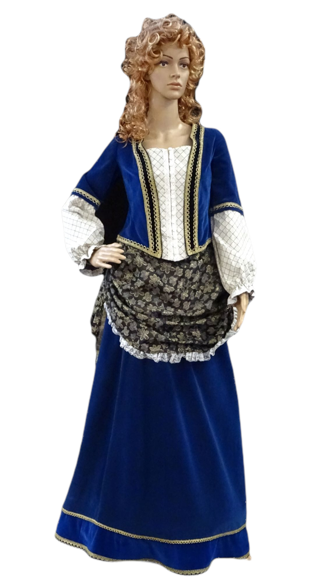 Viktorianisch/ Gründerzeit KleidAurelie:Oberteil mit Knopfleiste und Goldborte, Rock mit Tournüre - blauer Samt mit Goldborte. Weitere gleiche Artikel AU002, AU003