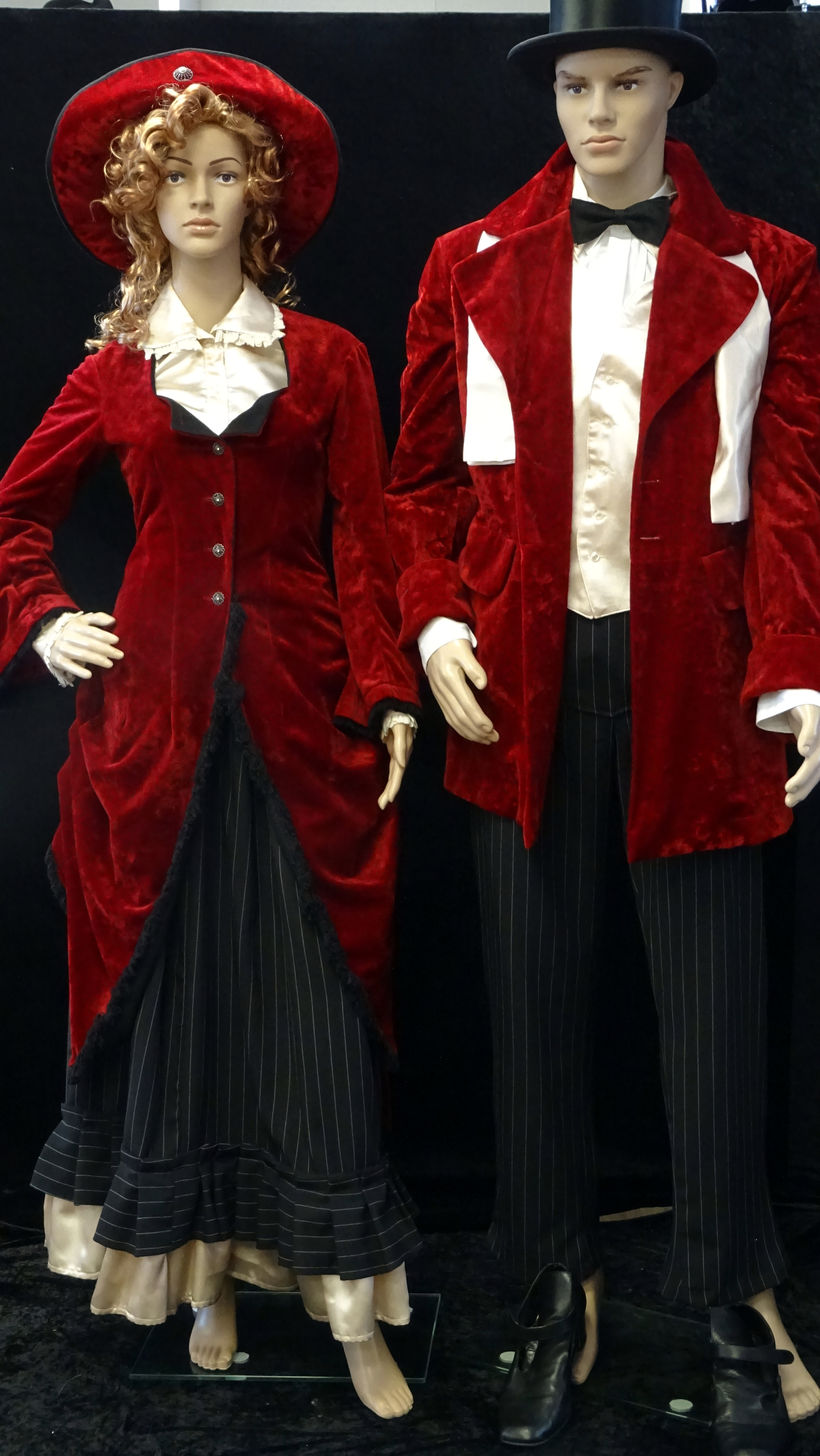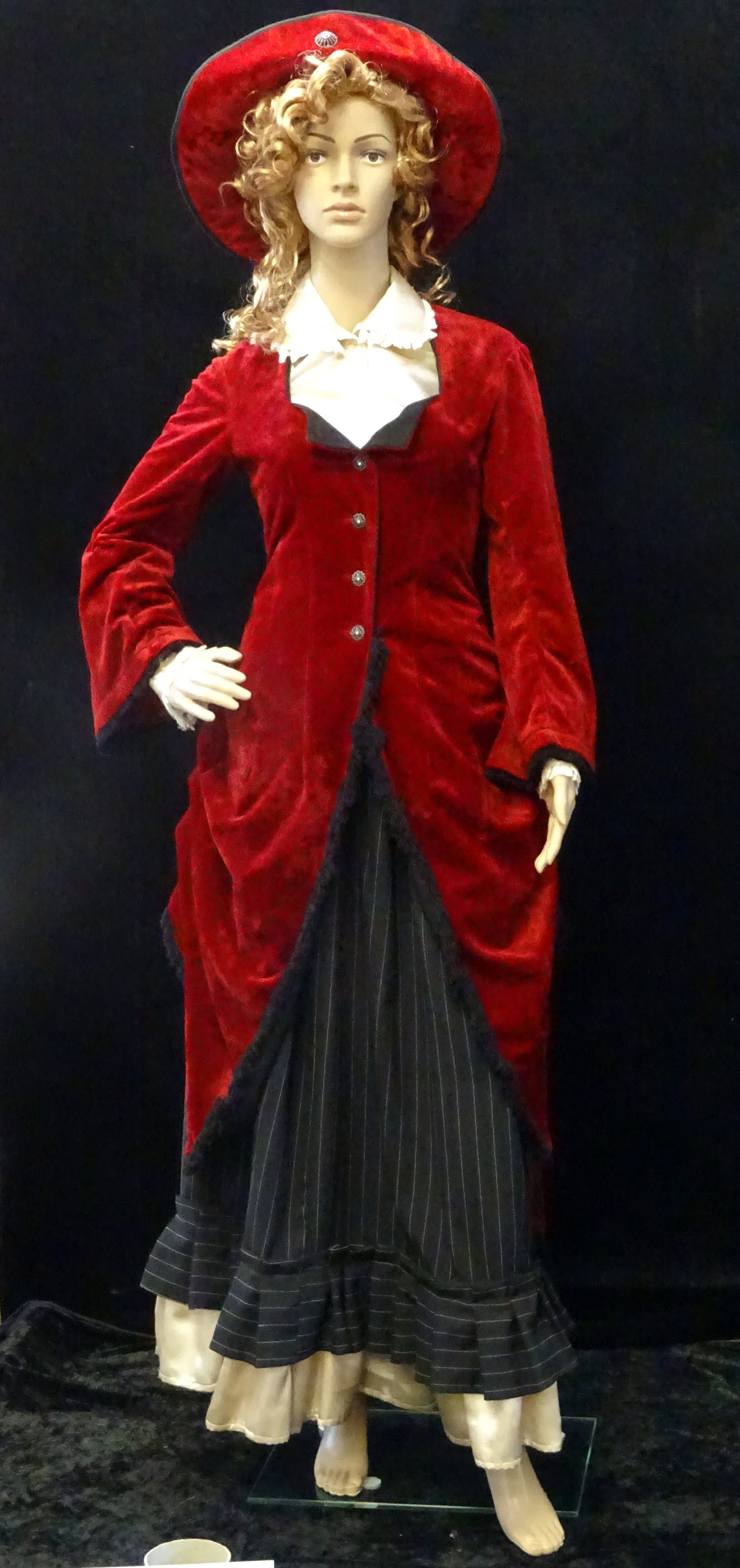 Viktorianische Dame Polonaise (Tournürenüberkleid), Basisrock (Nadelstreifen), Bluse (creme), weinrot. Weitere gleiche Artikel V118-V119, V123, V126