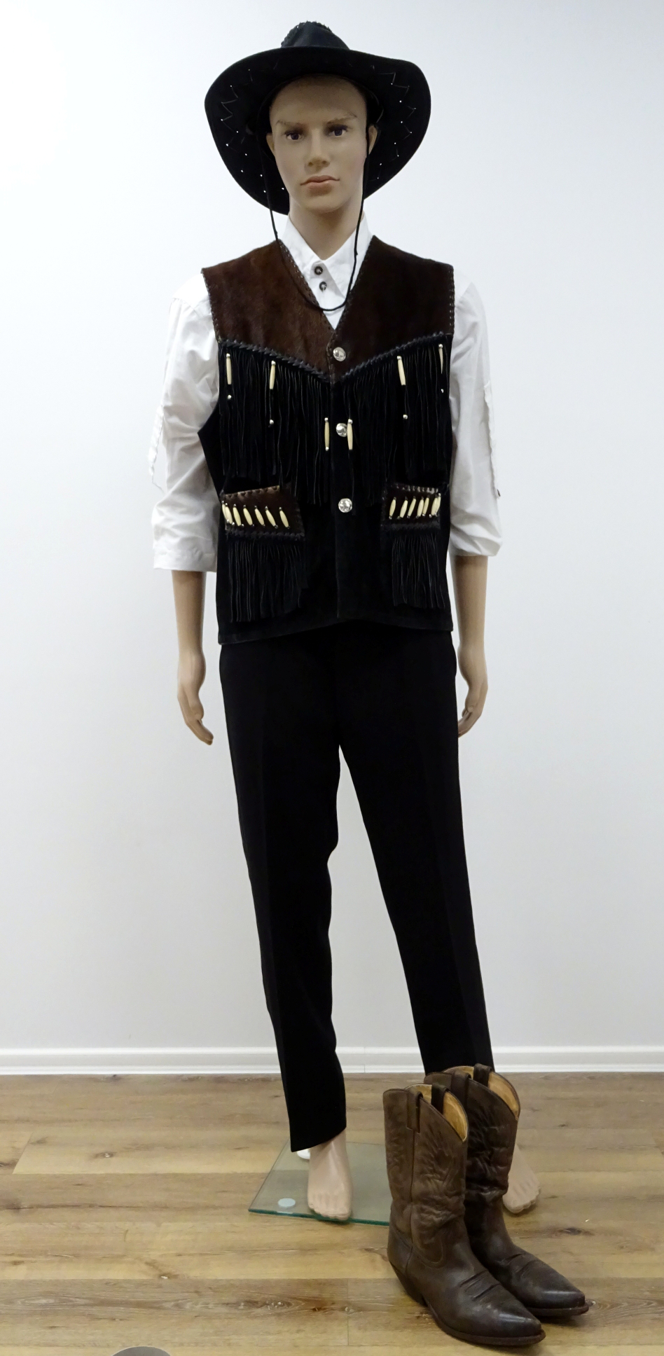 Westernweste, schwarz-Echt Leder mit Fell, Fransen u.Holzverziehrung, Metallknöpfe Büffel