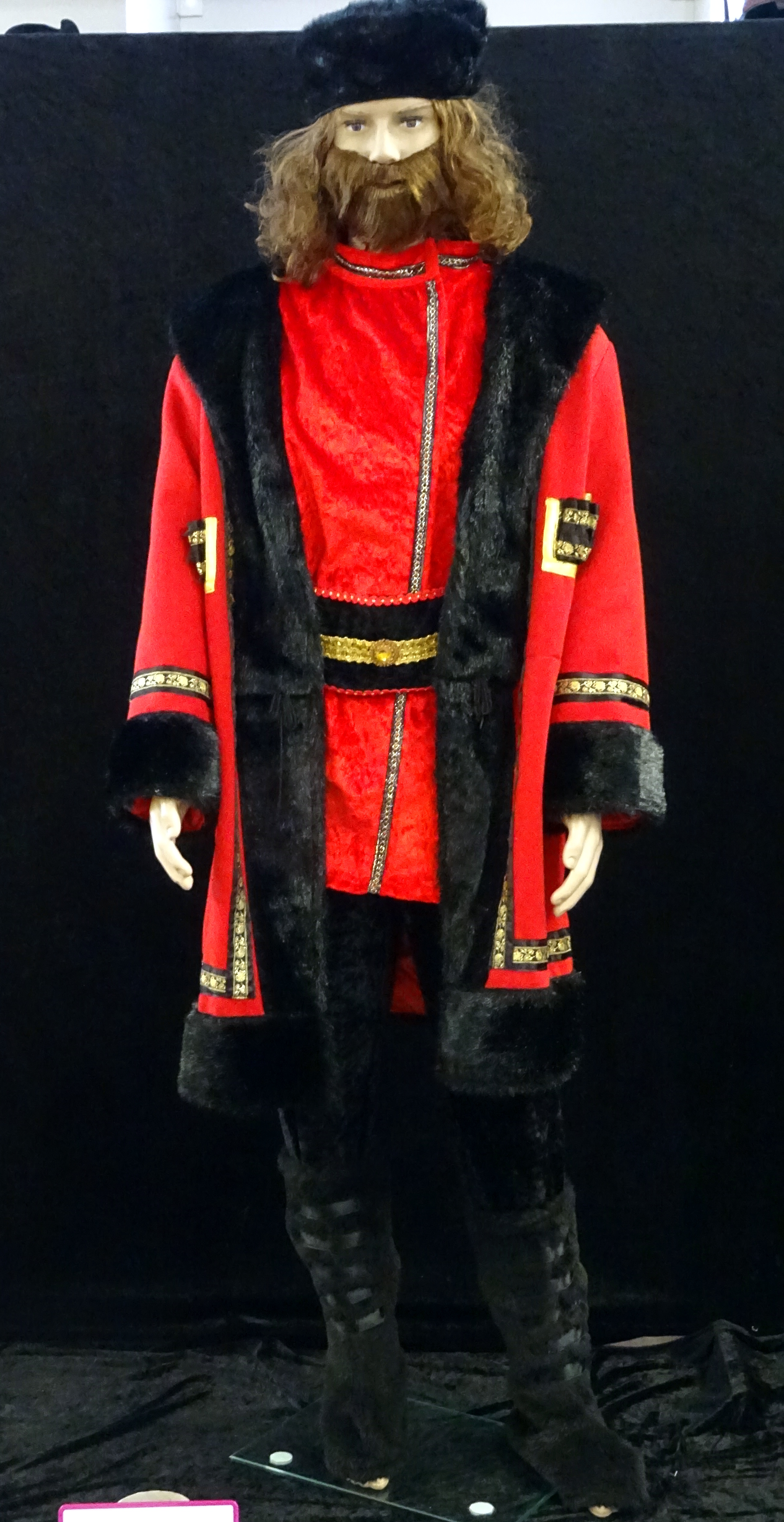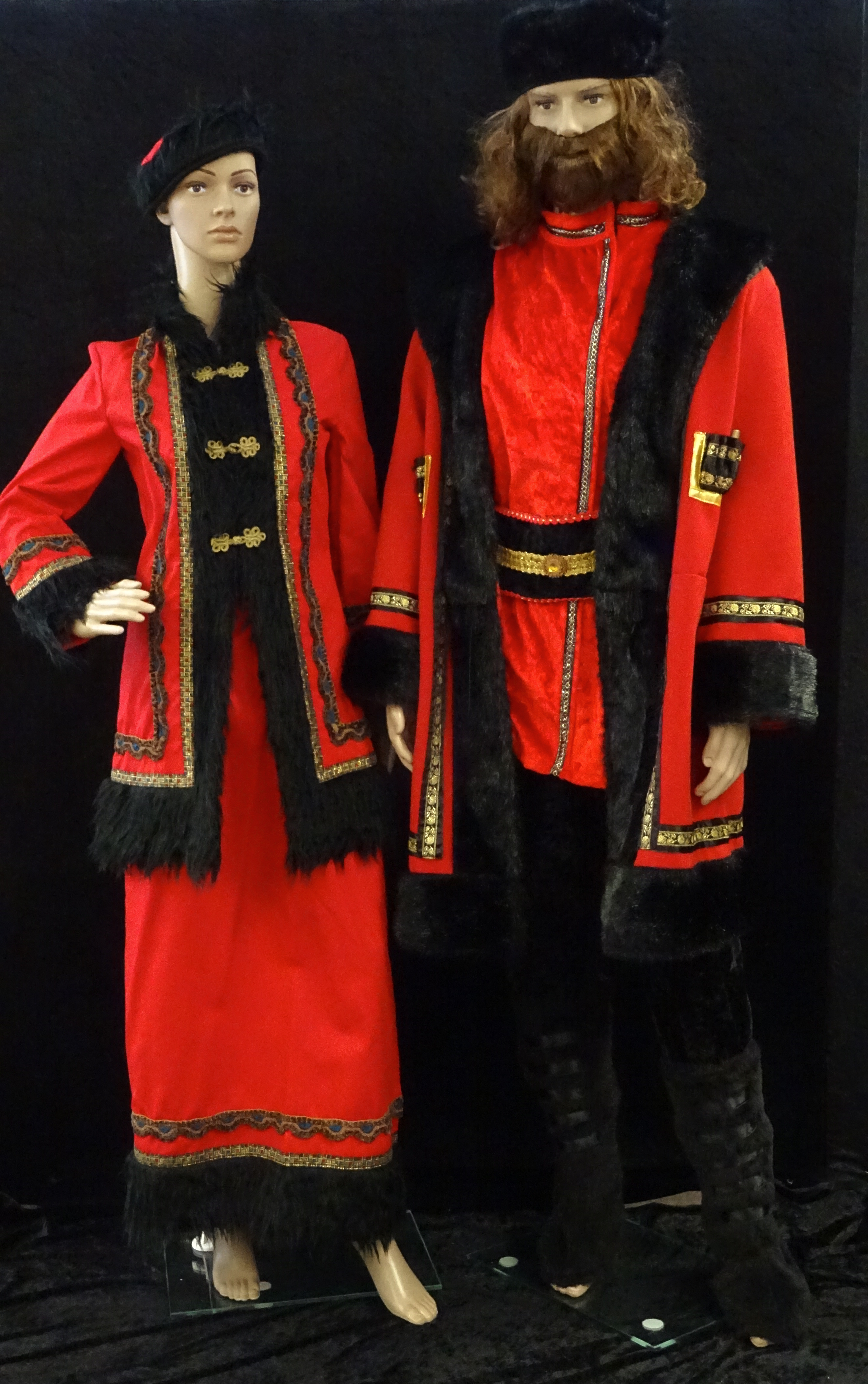Zar: schwarze Hose, rotes Kosackenhemd, schw. Bauchschärpe, rot. Mantel, Pelzmütze, rot-schwarz-gold